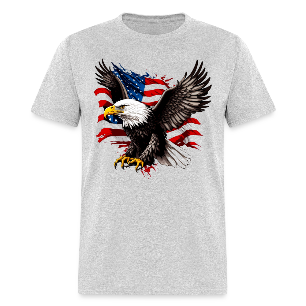 The centerpiece of this T-shirt is a captivating graphic featuring an American eagle with its wings majestically spread wide. The eagle symbolizes courage, liberty, and resilience, while its striking presence evokes a sense of awe and admiration. Set against the backdrop of the American flag, this design captures the deep connection between this noble creature and the spirit of the United States.