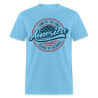 At the heart of the graphic is a striking red circular image, commanding attention and symbolizing unity. The powerful blue lettering of "America" in the center proudly represents our country, while the words "Land of the Free" grace the top half of the circle, emphasizing the fundamental principle of liberty that defines us.