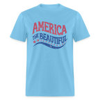 The focal point of the design is the word "America" in bold red letters, symbolizing our nation's strength and unity. Below it, the phrase "The Beautiful" stands out in vibrant blue, accompanied by thirteen red stars. These stars pay homage to the original thirteen colonies, representing our rich history and the spirit of independence.