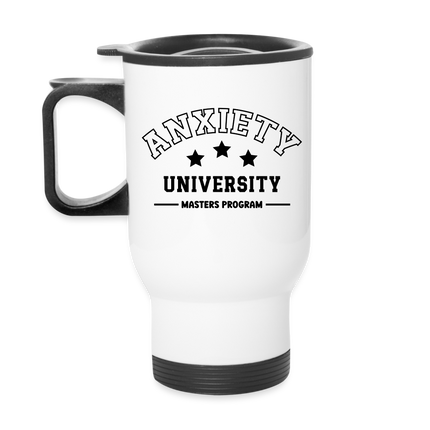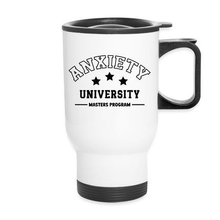 Crafted with durable materials and a sleek design, this travel mug features the bold text "Anxiety University Masters Program." It's the perfect companion for those who have earned their degree in navigating the ups and downs of life with grace and humor.