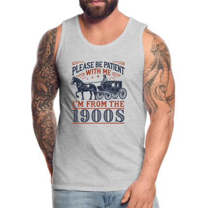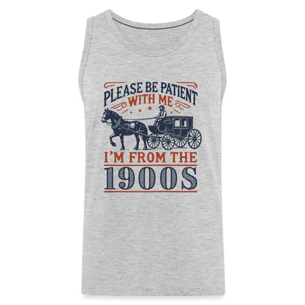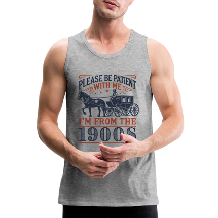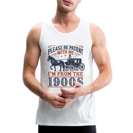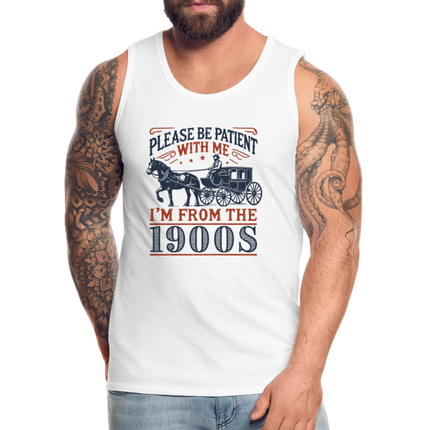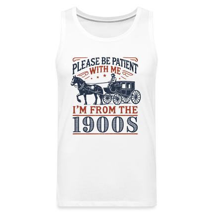 Show off your sense of humor and vintage charm with the "Be Patient With Me I'm From the 1900's" Men’s Premium Tank Top. Featuring the amusing text "Please Be Patient With Me I'm From the 1900's" and an image of a classic horse and buggy, this tank top is a fun and light-hearted way to make a statement about your age.