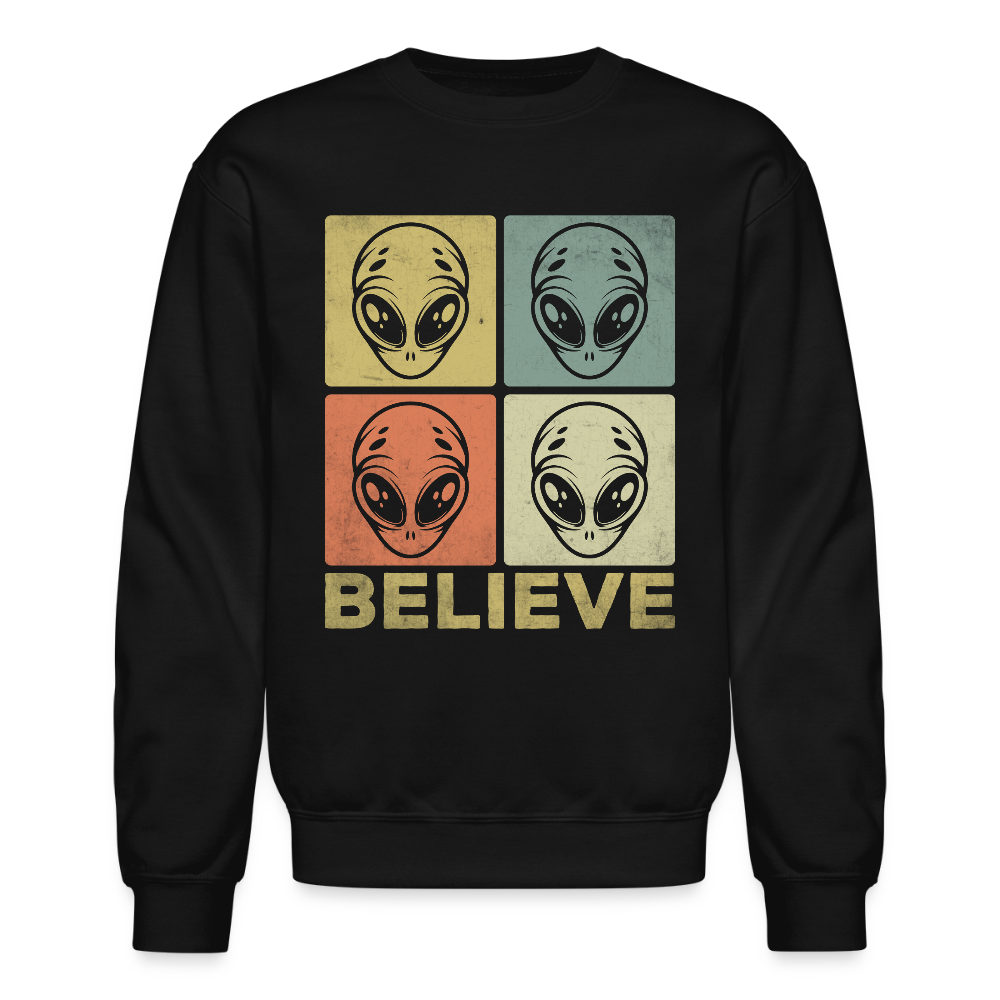 This Believe Alien Sweatshirt – Fun UFO Style with Alien Faces has a Normal Fit (Men's Sizing)