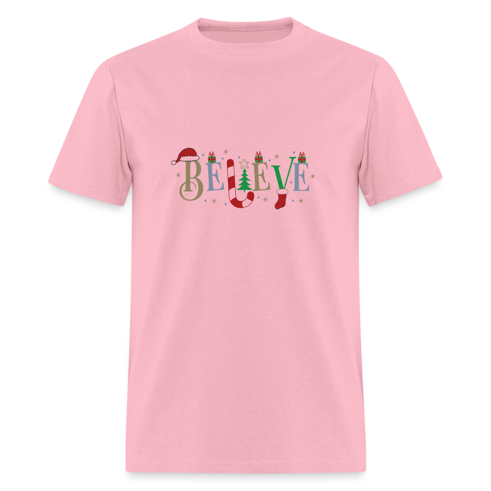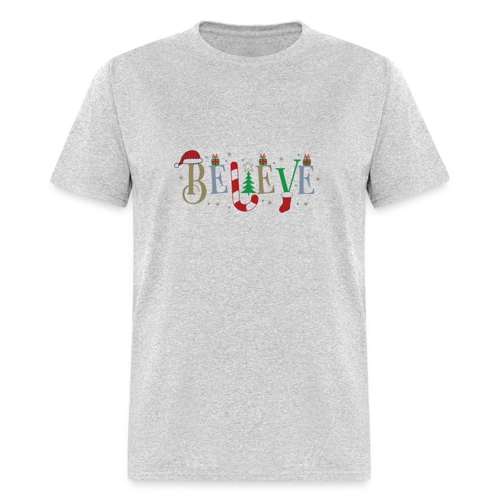 Get into the festive spirit with our enchanting "Believe T-Shirt." This delightful tee showcases the word "Believe" creatively designed in a charming Christmas theme, complete with Santa hats, stockings, candy canes, and wrapped gift boxes. As you wear this shirt, you'll embody the magic of the holiday season and inspire those around you to believe in the joy and wonder it brings.
