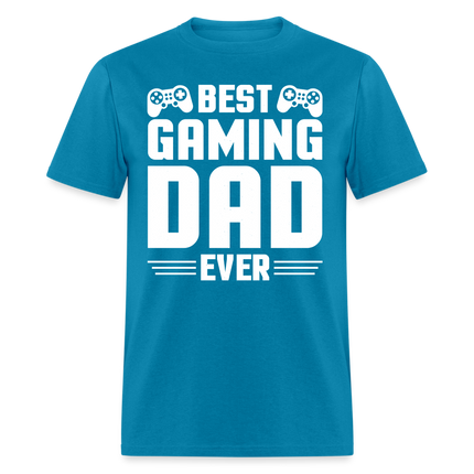 The eye-catching print on this t-shirt features the words "Best Gaming Dad Ever" front and center, emphasizing the pride and recognition that comes with being a skilled gaming dad. The design is sleek and modern, with a focus on the word "Dad" to highlight the special role and expertise of fathers in the gaming world. To add a playful touch, the image also includes two remote controls, symbolizing the countless hours of fun and bonding that take place while gaming together.