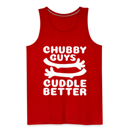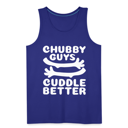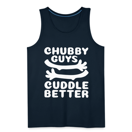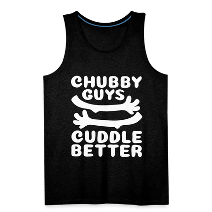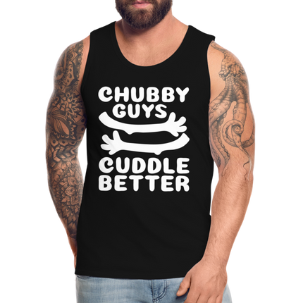 Introducing our "Chubby Guys Cuddle Better" Men’s Premium Tank Top – a stylish and playful ode to the warmth and charm of a fuller embrace! This tank top features a heartwarming message that boldly states, "Chubby Guys Cuddle Better," accompanied by a delightful image of two arms wrapped around in a snug and comforting hug.