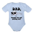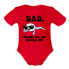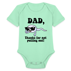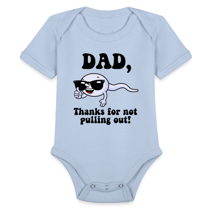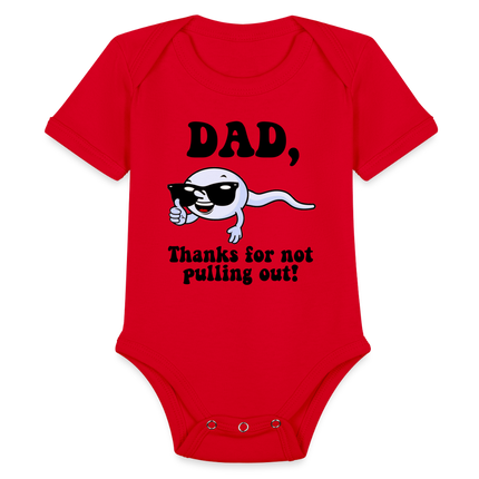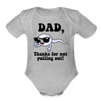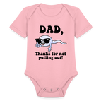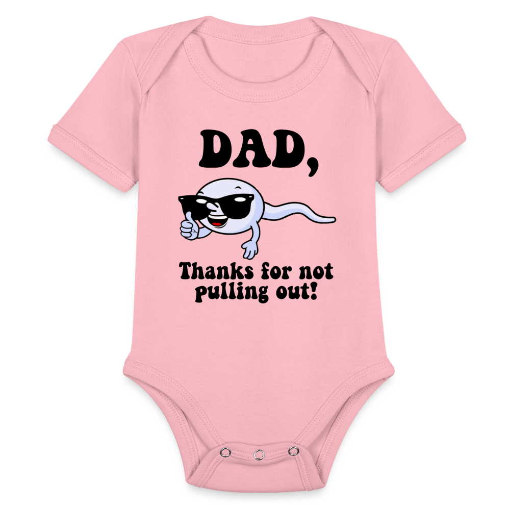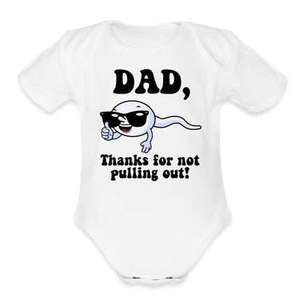 Introducing the "Dad, Thanks For Not Pulling Out Short Sleeve Baby Bodysuit" - a humorous and cheeky addition to your baby's wardrobe. This baby bodysuit adds a touch of light-heartedness to your little one's outfit, showing appreciation to dad with a smile. Crafted for both comfort and a chuckle, it's perfect for your baby's everyday wear. The design resonates with parents who enjoy a bit of playful humor, creating a sense of shared laughter and bonding. Dress your baby in style and fun with our "Dad, Thanks For Not Pulling Out Short Sleeve Baby Bodysuit."