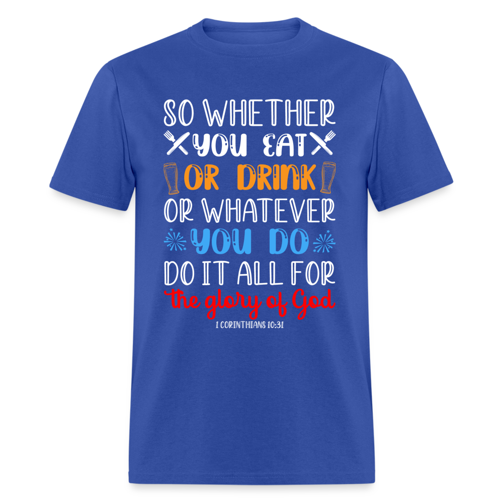 Introducing the "Do It All For The Glory Of God T-Shirt," inspired by the uplifting message from 1 Corinthians 10:31. This t-shirt is a meaningful addition to your wardrobe, featuring the scripture reference and a motivating image as a reminder to live every moment in a way that brings glory to God. Crafted with both faith and fashion in mind, it's perfect for casual wear and for sharing the message of purpose and devotion. The design resonates with those who seek to align their actions with their faith, creating a sense of shared spiritual connection. Elevate your fashion while spreading a message of devotion with our "Do It All For The Glory Of God T-Shirt."