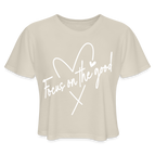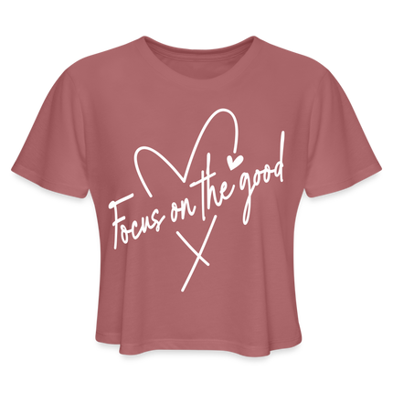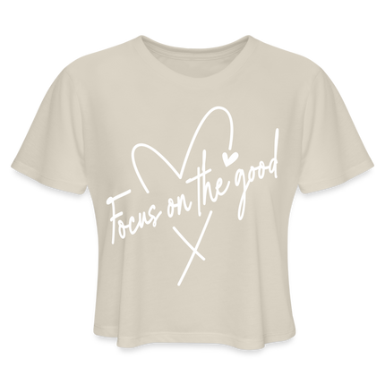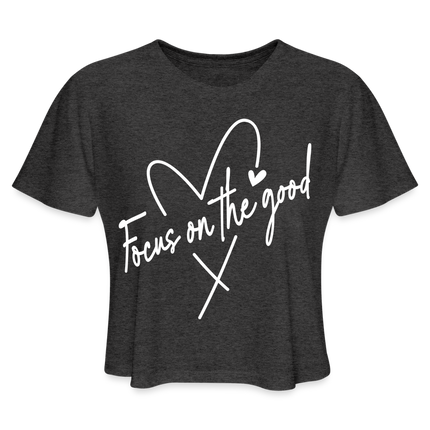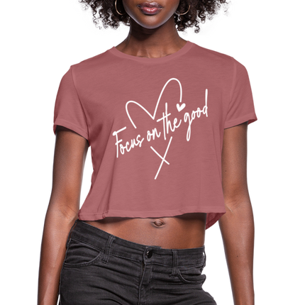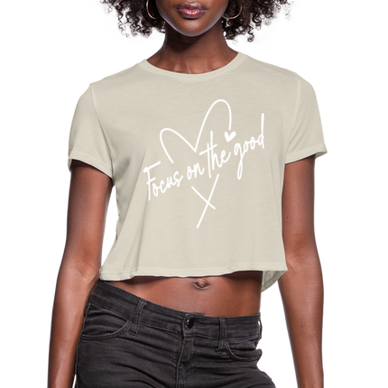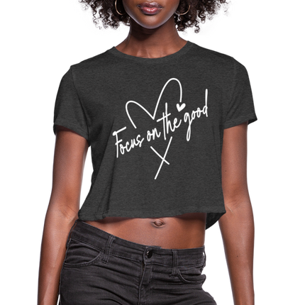 Designed for both comfort and trendiness, this women's cropped tee carries the uplifting message "Focus on the Good" in clean white letters. The soft fabric ensures a comfortable and stylish fit, making it a versatile and inspiring addition to your wardrobe.