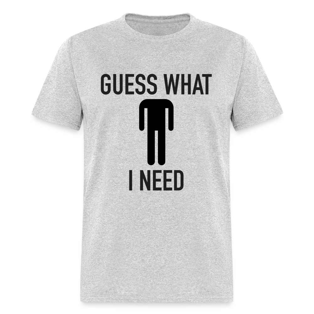 Introducing our "Guess What I Need" T-Shirt – a hilarious twist on a classic phrase that's sure to make a statement! Get ready to tickle funny bones and turn heads with this witty design featuring a headless stick figure and the suggestive phrase "Guess What I Need." Whether you're out for a night on the town or just looking to add some humor to your wardrobe, this tee is guaranteed to spark laughs and start conversations.