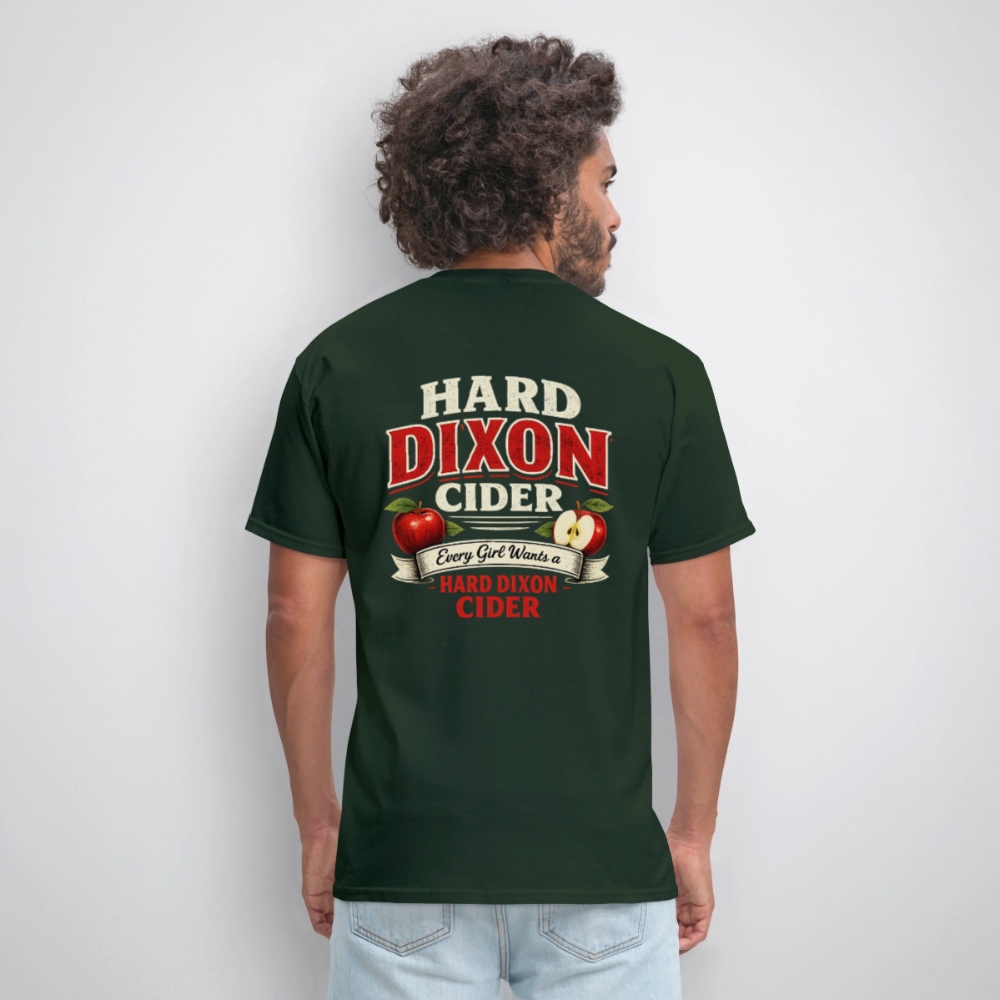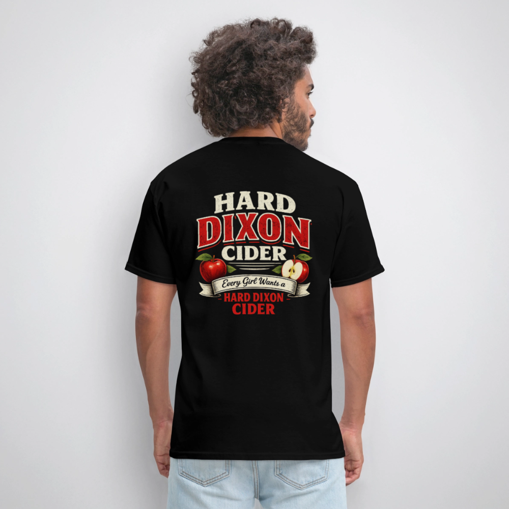 The Hard Dixon Cider T-Shirt delivers bold adult humor with a craft-cider style design that looks like authentic taproom merchandise at first glance. The small front chest print features a clean Hard Dixon Cider logo inspired by classic cider house branding, giving the shirt a subtle brewery-style look. Turn around and the full rear print reveals the real punchline with the hilarious slogan Every Girl Wants a Hard Dixon Cider, creating the perfect double-take moment that makes people laugh once they read it.