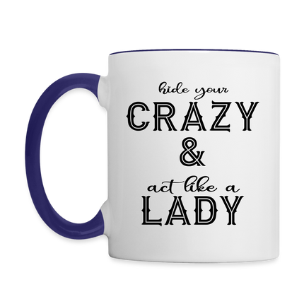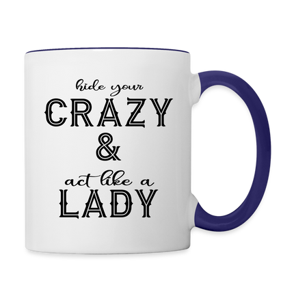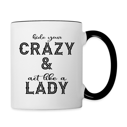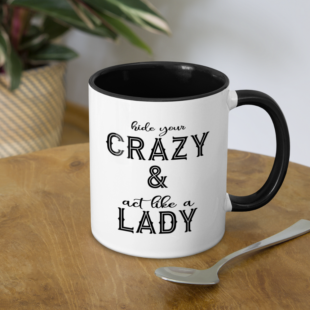 Introducing the "Hide Your Crazy & Act Like A Lady Coffee Mug" - a sassy and fun addition to your morning routine. This coffee mug cheekily advises keeping your wild side under wraps while maintaining a ladylike demeanor with the phrase "Hide Your Crazy & Act Like A Lady." Crafted for both style and function, it's perfect for sipping your favorite brew while adding a touch of sass to your day. The design resonates with those who embrace their unique personalities and playfully navigate social conventions, creating a sense of shared wit and confidence. Elevate your coffee experience while embracing your inner spirit with our "Hide Your Crazy & Act Like A Lady Coffee Mug."