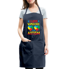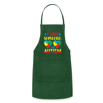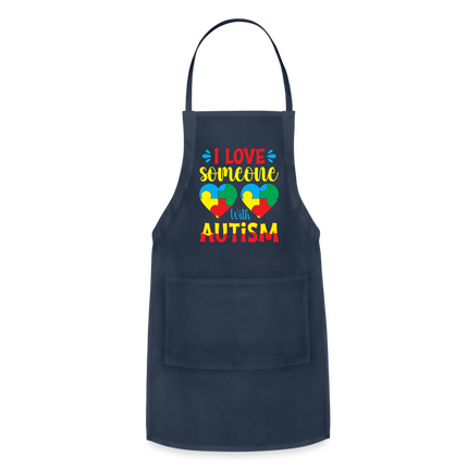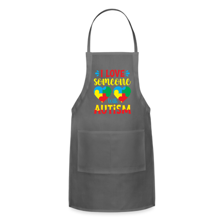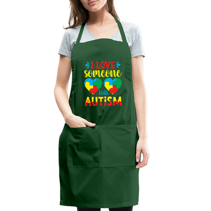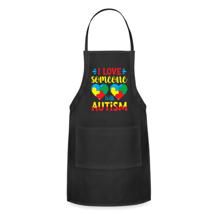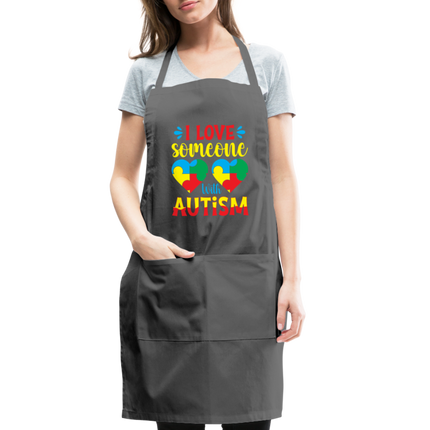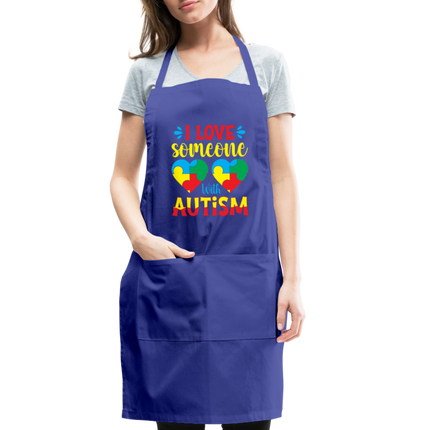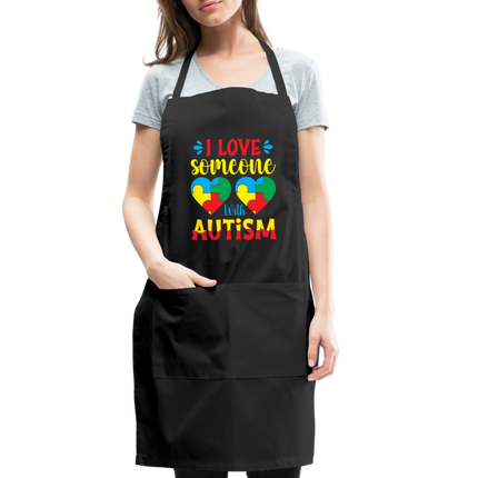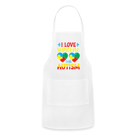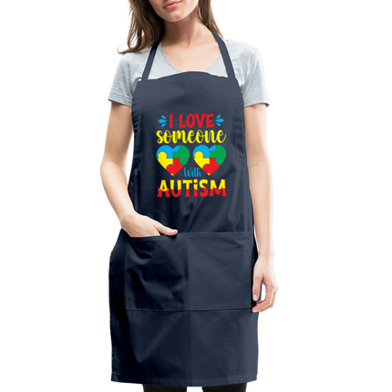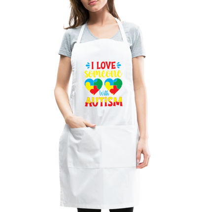 The apron features the meaningful message "I Love Someone With Autism" alongside two hearts filled with the autism puzzle design. It's a beautiful way to share your love and understanding in the kitchen or while working on creative projects.