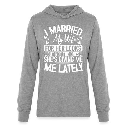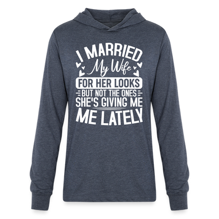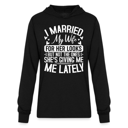 Bring humor into your attire with our "I Married My Wife For Her Looks" Long Sleeve Hoodie Shirt. This shirt features a witty text: "I Married My Wife For Her Looks, But Not The Ones She's Giving Me Lately."