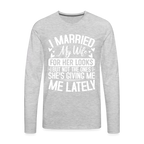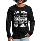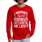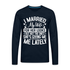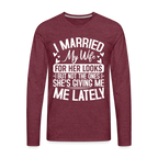 Inject humor into your wardrobe with our "I Married My Wife For Her Looks" Men's Premium Long Sleeve T-Shirt. This premium long sleeve tee features a witty text: "I Married My Wife For Her Looks, But Not The Ones She's Giving Me Lately."