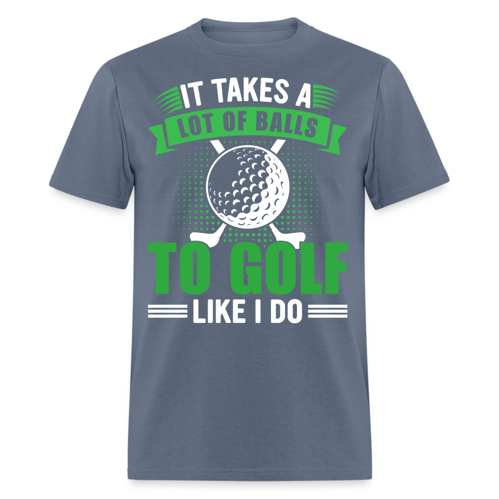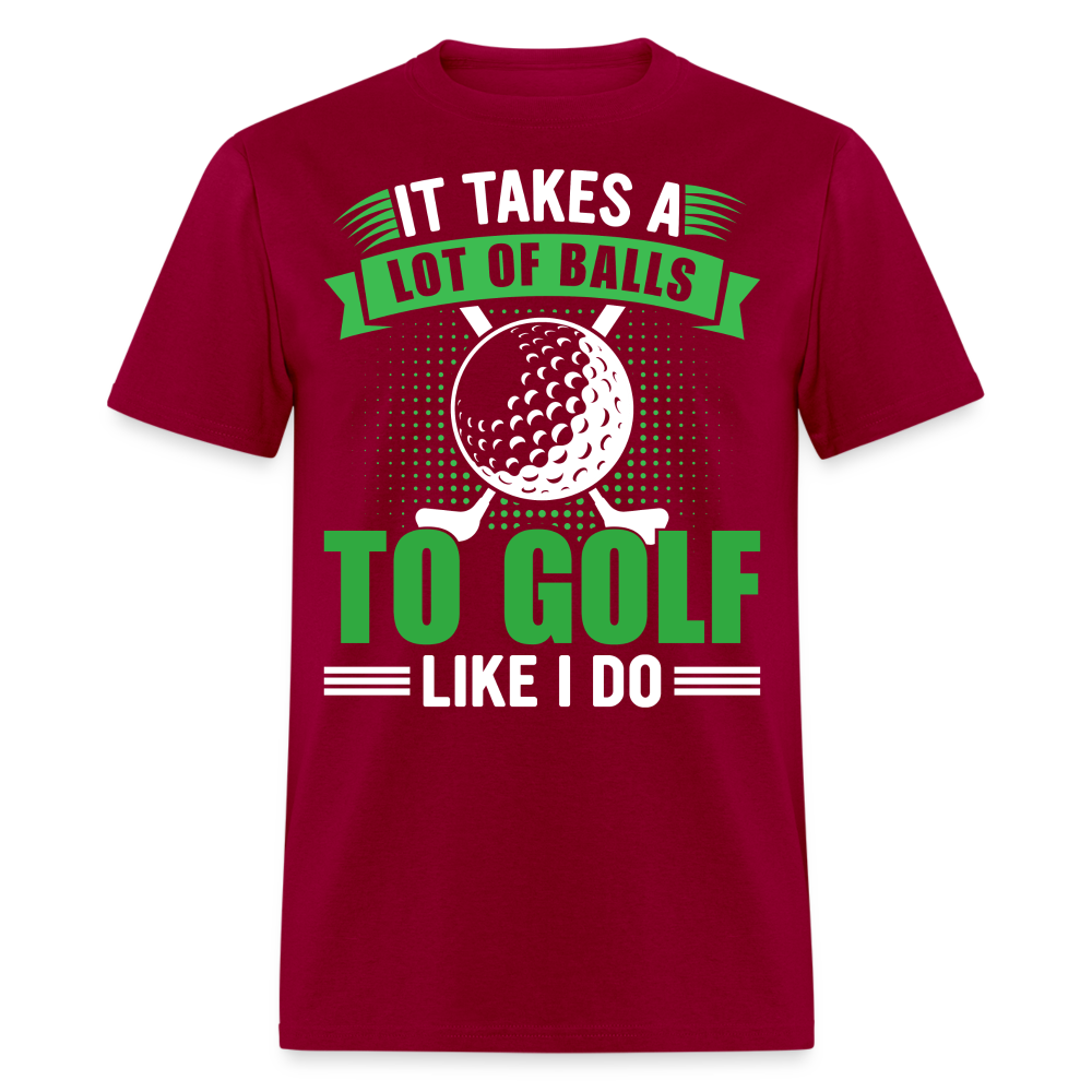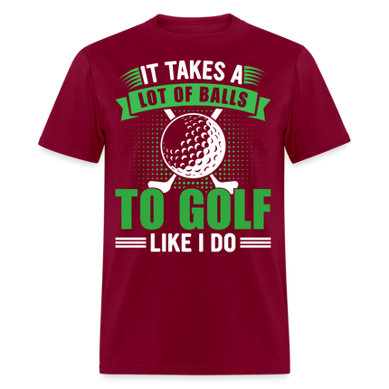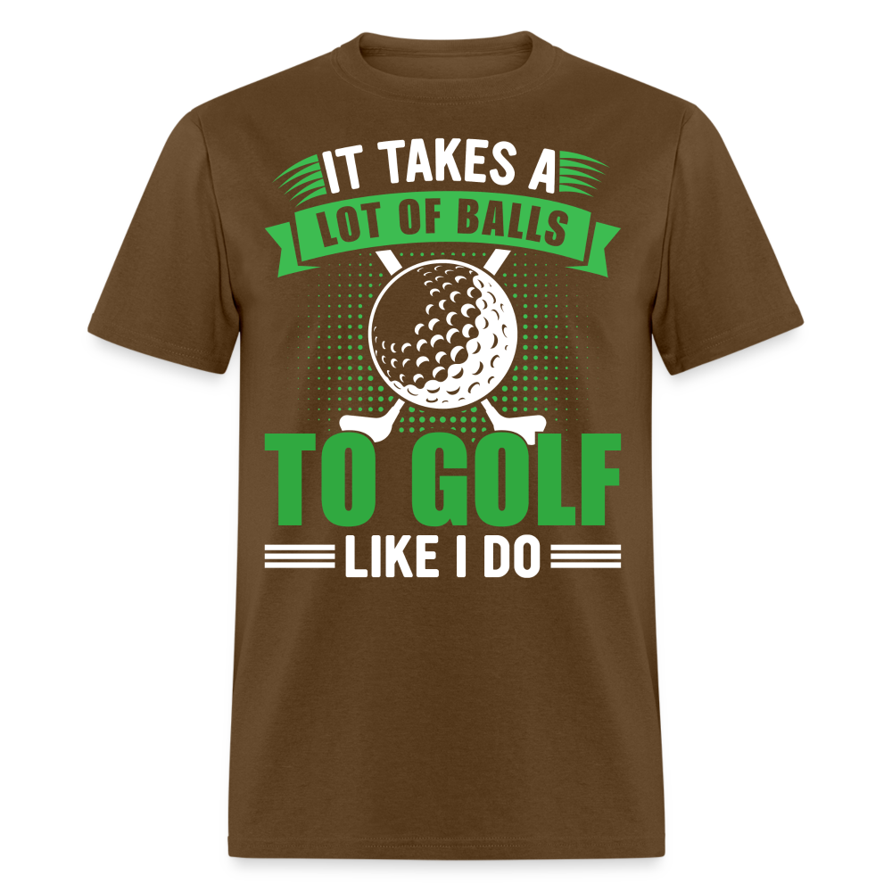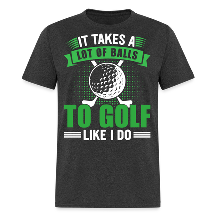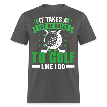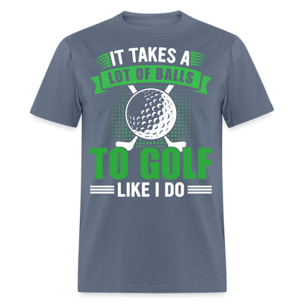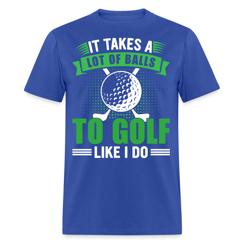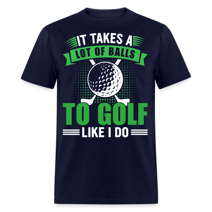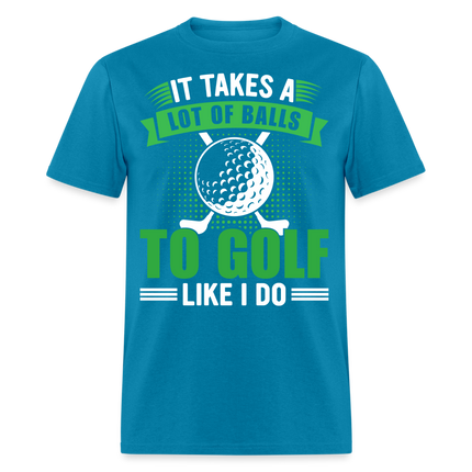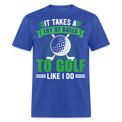 The shirt features a large image of a golf ball and two golf clubs, representing the essential tools of the game. Accompanying the image is the text that reads, "It Takes A Lot of Balls to Golf Like I Do." This humorous phrase playfully emphasizes the courage and determination required to excel at golf, adding a touch of lightheartedness to your golf attire.