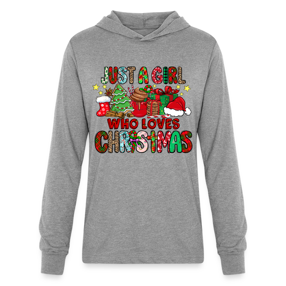 Express your love for the festive season with this cozy and stylish hoodie shirt. Featuring the delightful message "Just A Girl Who Loves Christmas," this shirt is adorned with charming Christmas-themed elements, including a Christmas tree, Santa hat, stocking, and wrapped gifts.