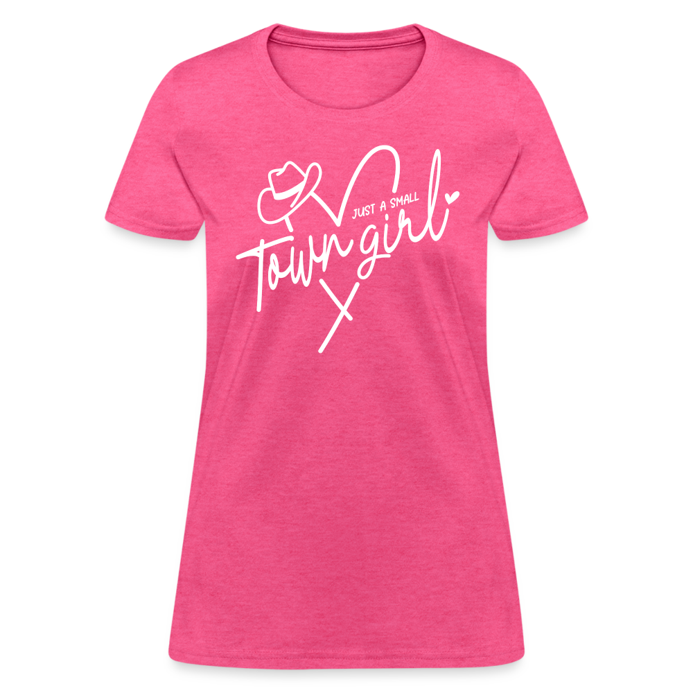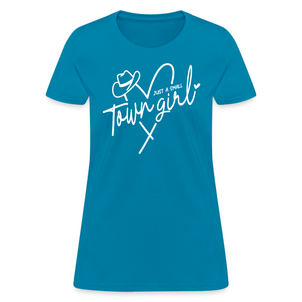 Introducing the "Just A Small Town Girl" T-Shirt, a charming and heartwarming design that celebrates the spirit of small-town living. This exclusive print features the text "Just A Small Town Girl" with a cowgirl hat resting on top of a heart in the background - a perfect representation of the strong roots and love for rural life.