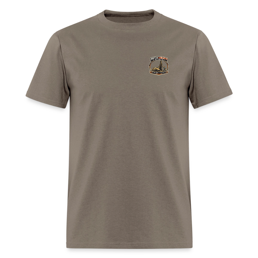 The Justin Heranus Drilling Co. T-Shirt delivers bold adult humor with a realistic contractor logo design that looks like a true blue-collar company uniform. This double-sided print makes it even more authentic, featuring a small chest logo on the front and a large, full-size graphic on the back for maximum impact. The design showcases a heavy-duty drill rig truck with a skilled worker guiding the drill, framed in a vintage contractor badge that reinforces the rugged industrial style.