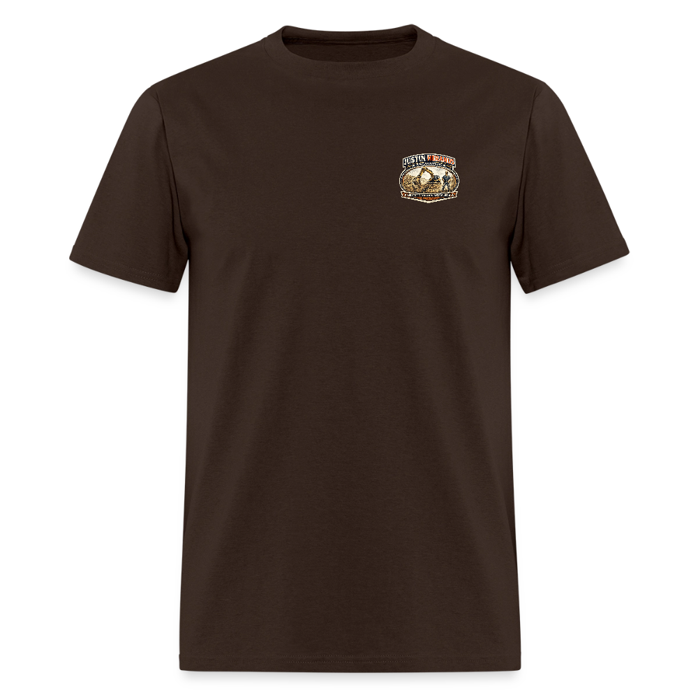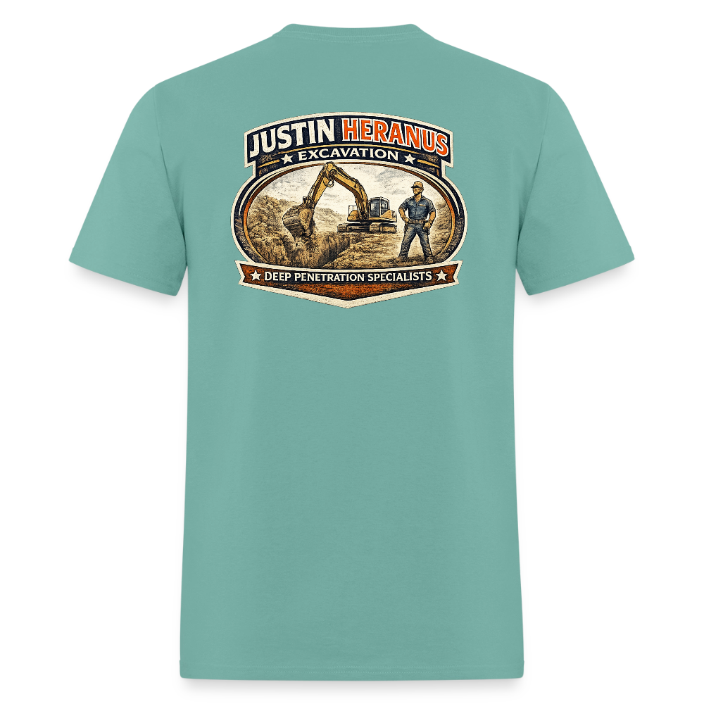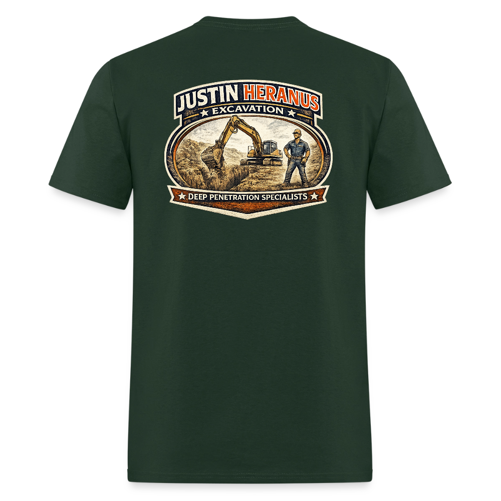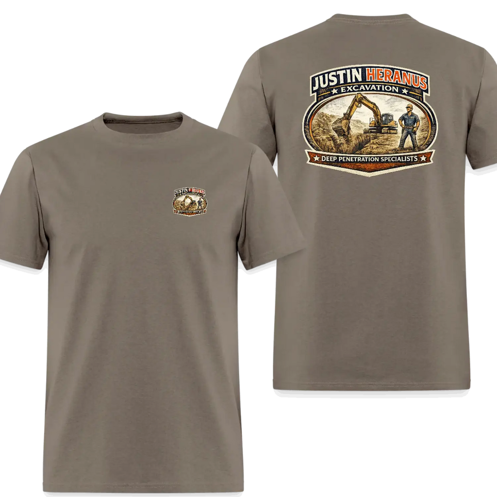 The Justin Heranus Drilling Co. T-Shirt delivers bold contractor style and clever adult humor with a double-sided print that looks like a real heavy equipment company uniform. The front features a small chest logo, giving it the clean, authentic look of a legitimate drilling company shirt. On the back, the large full-size graphic showcases a powerful drill rig truck with a confident worker guiding the drill, framed inside a rugged vintage contractor badge.