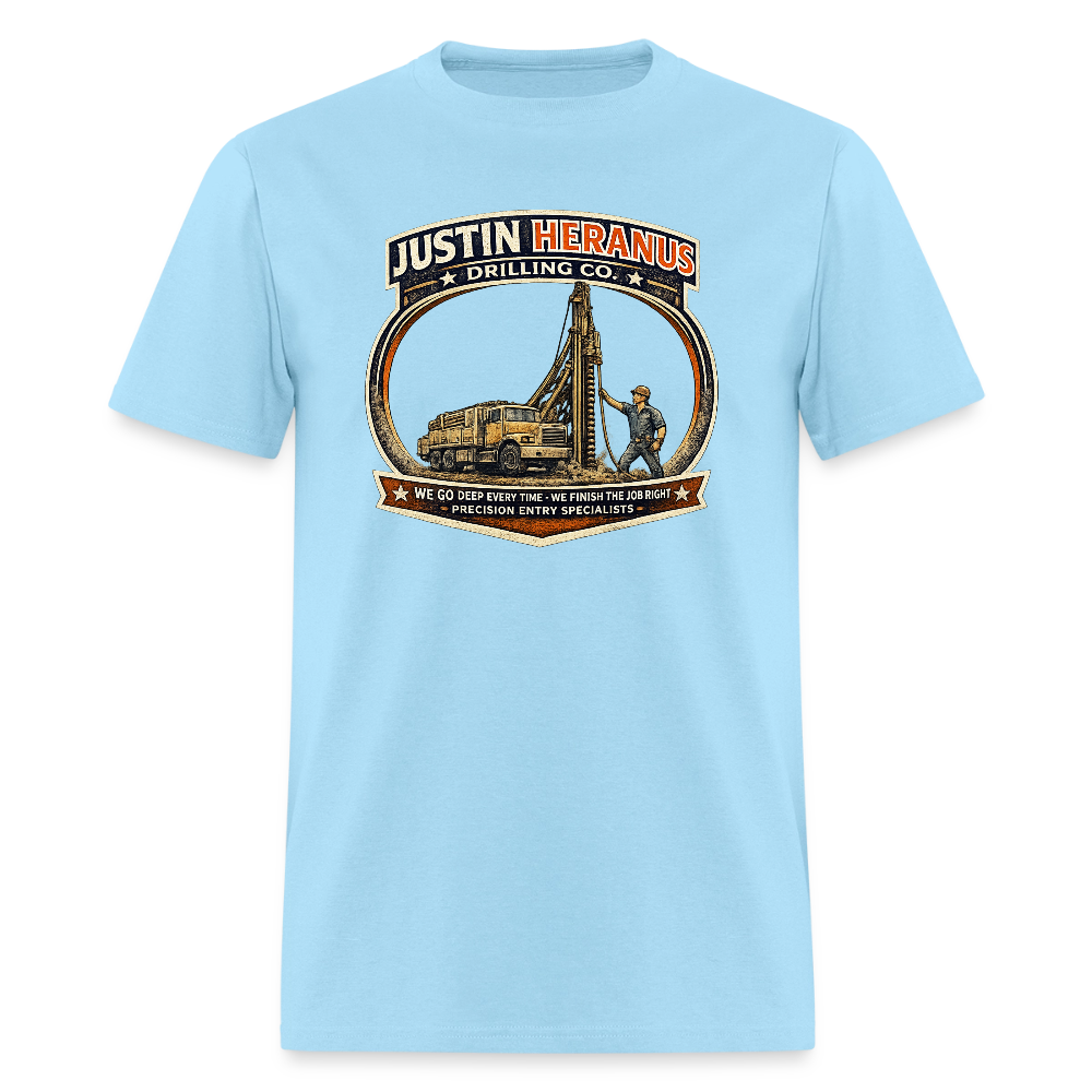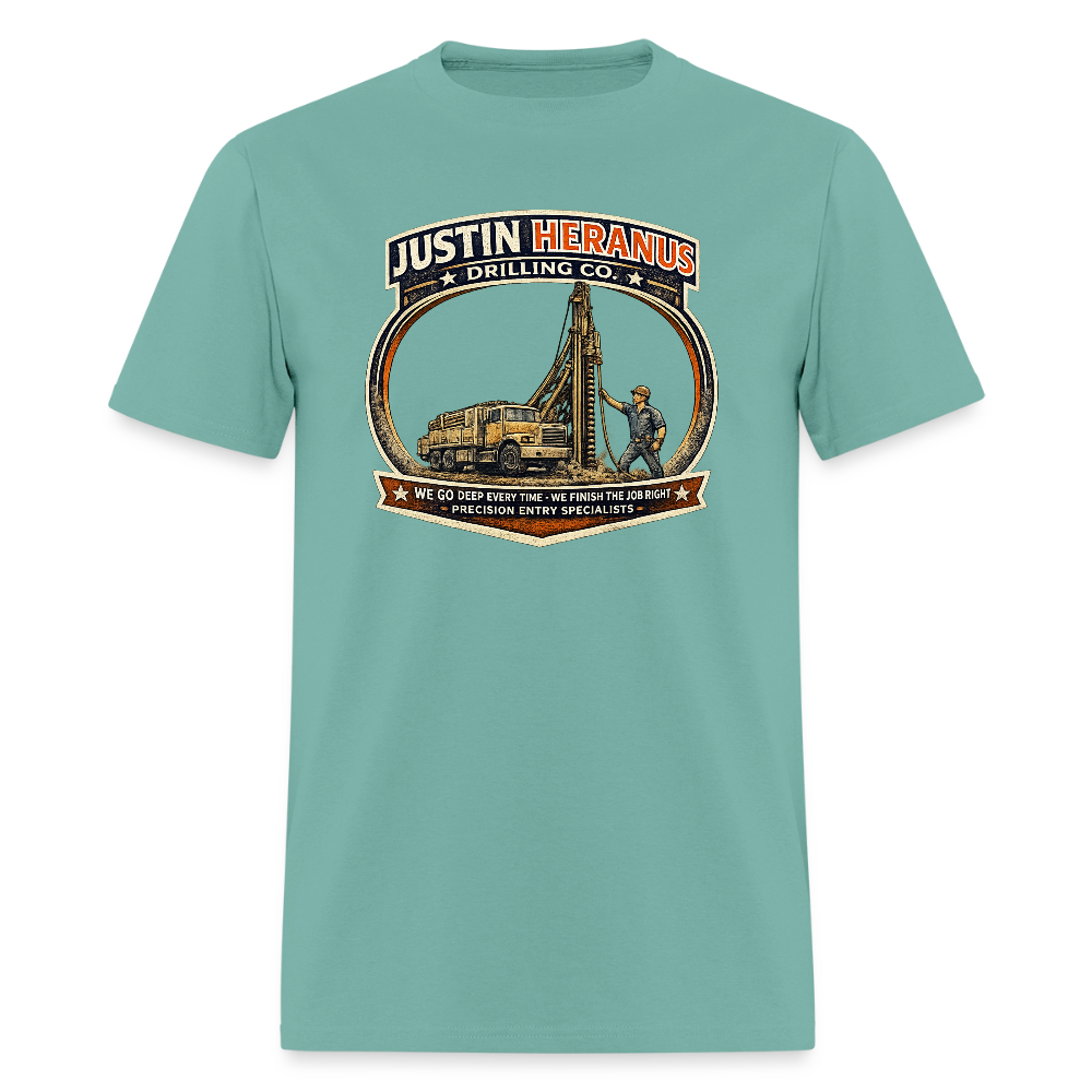 The Justin Heranus Drilling Co. T-Shirt delivers bold blue-collar style with a clever adult humor twist that looks like a real heavy equipment company logo. The design features a rugged drill rig truck with a skilled worker guiding the drill into the ground, framed in a vintage contractor badge that gives it an authentic and professional appearance. The distressed industrial style makes it look like a trusted drilling company uniform while hiding a hilarious sexual innuendo in plain sight.