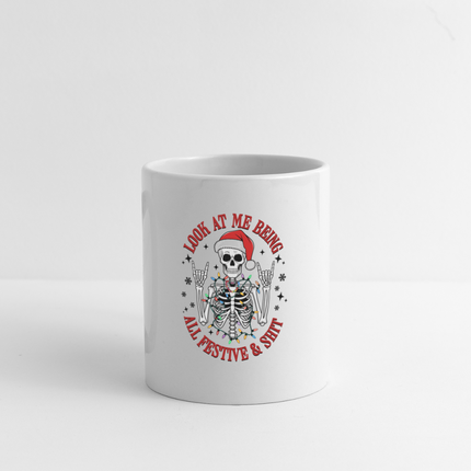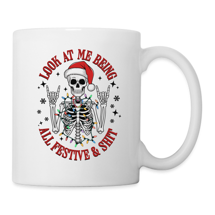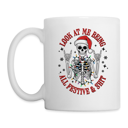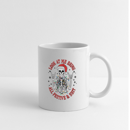 Start your mornings with a cup of coffee and a healthy dose of holiday sass! The Look At Me Being All Festive and Shit Coffee Mug features a playful design of a skeleton rocking a Santa hat and ornament lights glowing in its ribcage. It's the perfect blend of holiday cheer and dark humor, making it a fun and edgy addition to your Christmas drinkware collection.