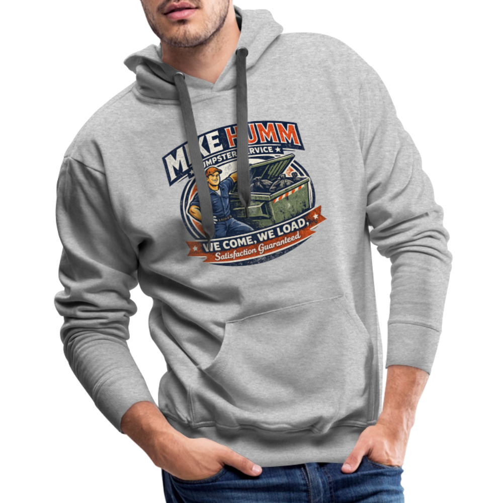 The Mike Humm Dumpster Service Men’s Premium Hoodie delivers bold adult humor with a rugged, blue-collar logo design that looks like it belongs on a real contractor uniform. The graphic features a confident worker leaning casually against an open dumpster, with the lid raised and framed in strong industrial detail. The vintage circular badge layout and distressed workwear style give the design an authentic, worn-in appearance that adds realism and personality.