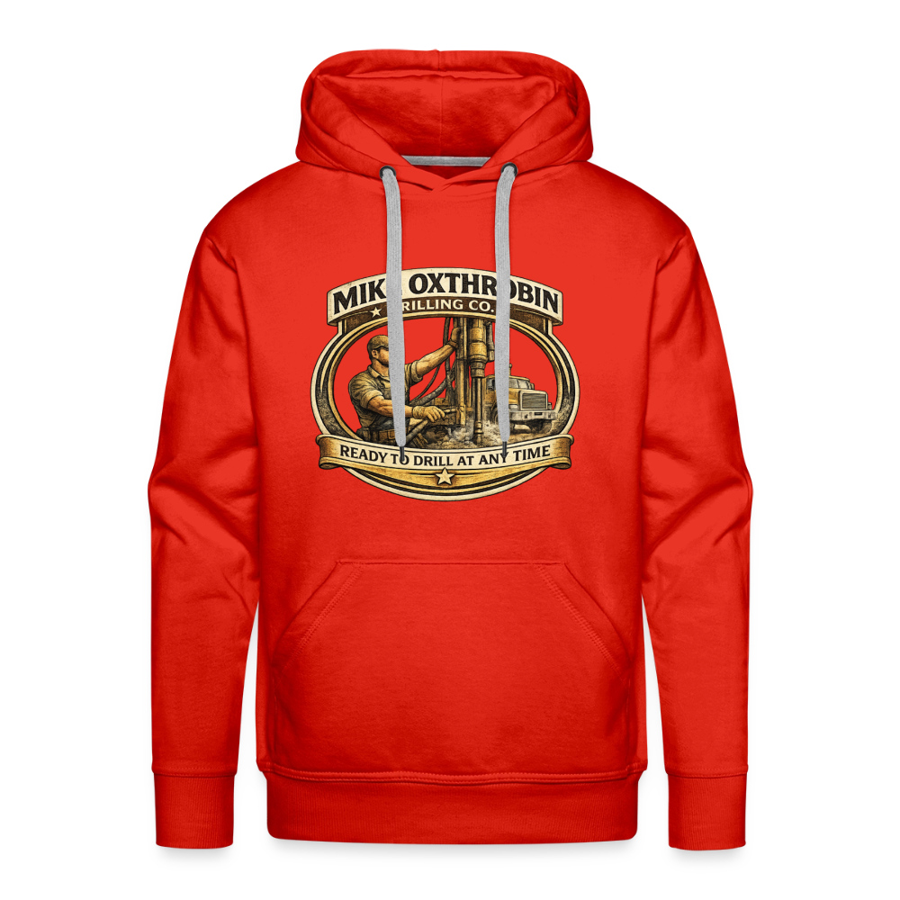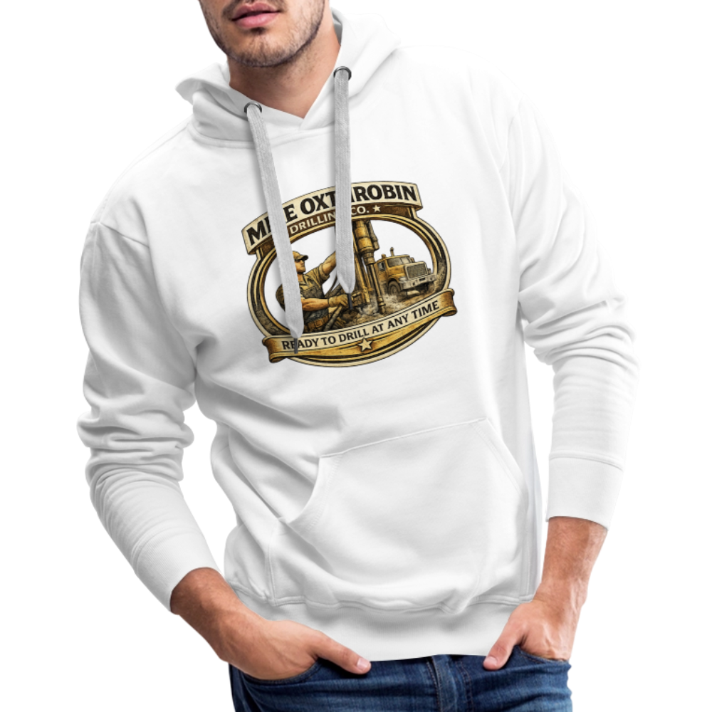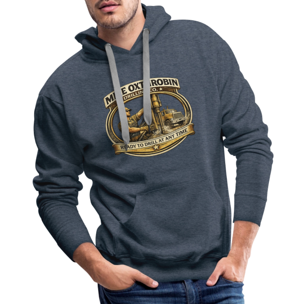 The Mike Oxthrobin Drilling Co. Men’s Premium Hoodie delivers rugged contractor style with bold adult humor in a design that looks like a real heavy equipment company uniform. The graphic features a powerful drill rig truck and a muscular worker confidently guiding the drill, framed inside a vintage contractor badge. The distressed industrial styling gives the logo an authentic, established look that feels like trusted blue-collar workwear while delivering clever sexual innuendo that makes the design unforgettable.