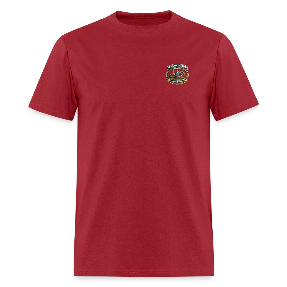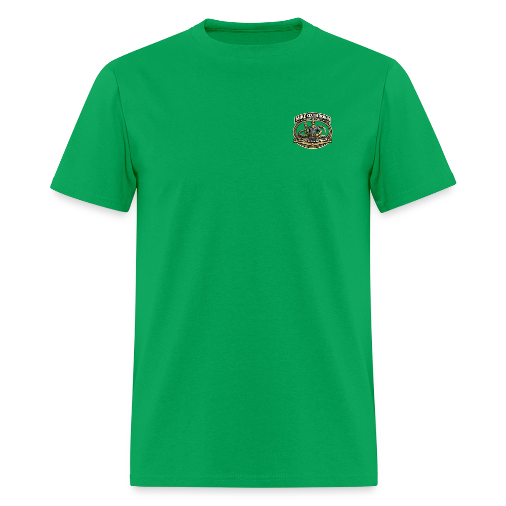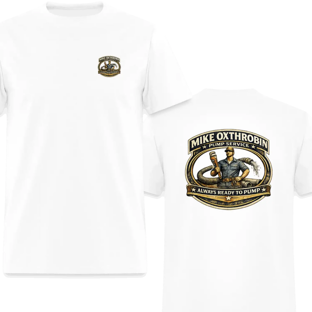 The Mike Oxthrobin Pump Service T-Shirt (Double-Sided Print) delivers authentic contractor style with bold adult humor in a design that looks like a real industrial company uniform. The front features a small chest logo, giving it the clean, professional appearance of a legitimate pump service company shirt. On the back, the large full-size graphic showcases a strong worker holding a heavy-duty industrial pump hose, framed in a rugged vintage badge that reinforces the blue-collar aesthetic.