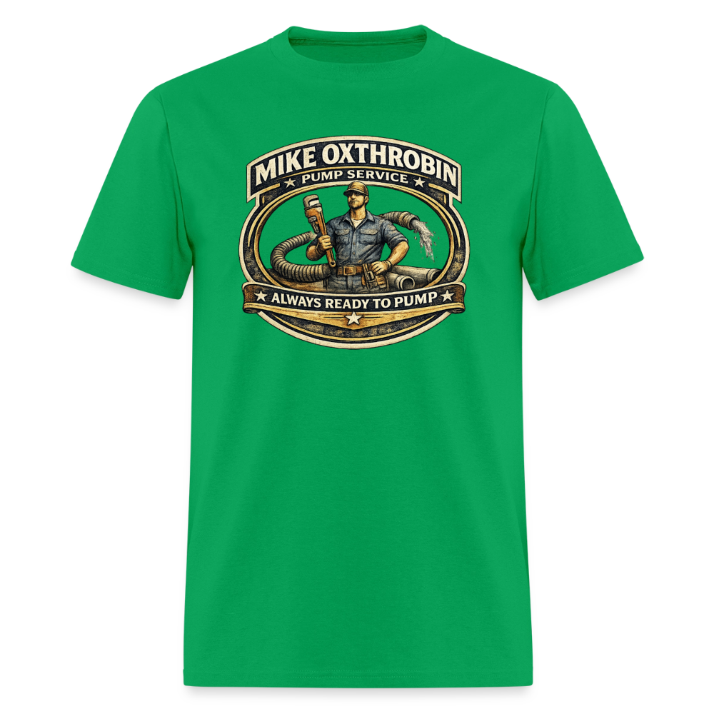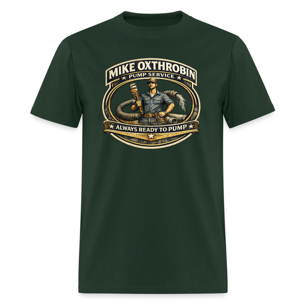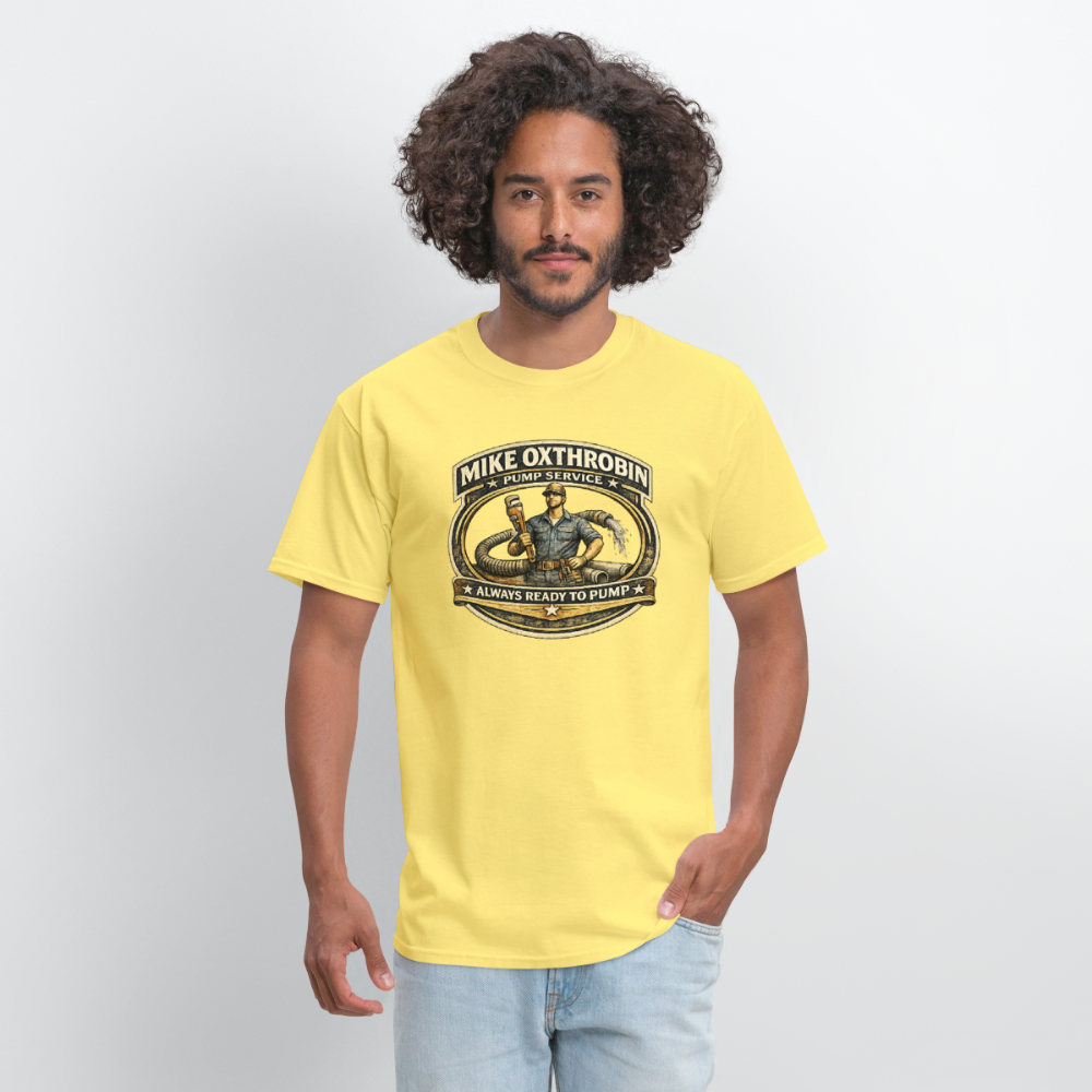 The Mike Oxthrobin Pump Service T-Shirt delivers bold blue-collar style with clever adult humor that looks like a real industrial company logo. The design features a strong, confident worker holding a heavy-duty industrial pump hose, framed inside a vintage contractor badge that gives it an authentic, rugged appearance. The distressed workwear style makes the logo feel like an established service company uniform while hiding a hilarious sexual innuendo in plain sight.
