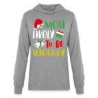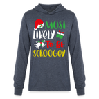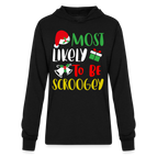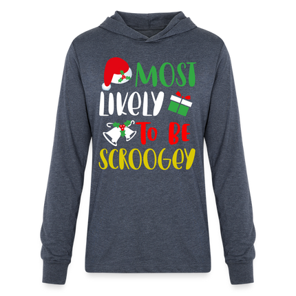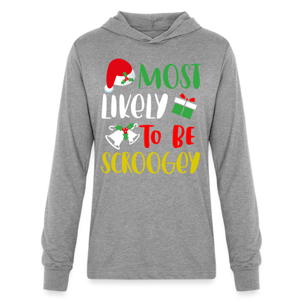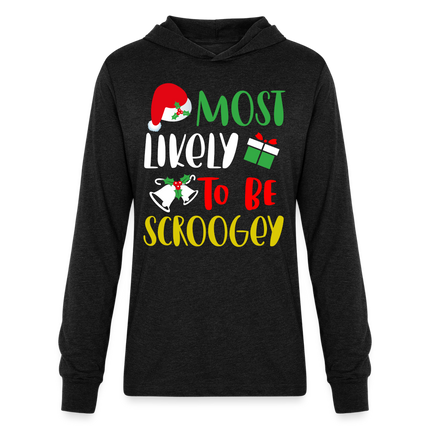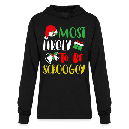 Bring a touch of humor to your winter wardrobe with this festive hoodie featuring the playful text "Most Likely To Be Scroogey." The design includes a Santa hat, a wrapped gift, and jingle bells for that extra dose of holiday spirit.