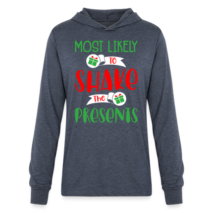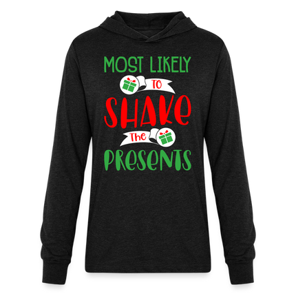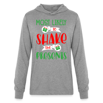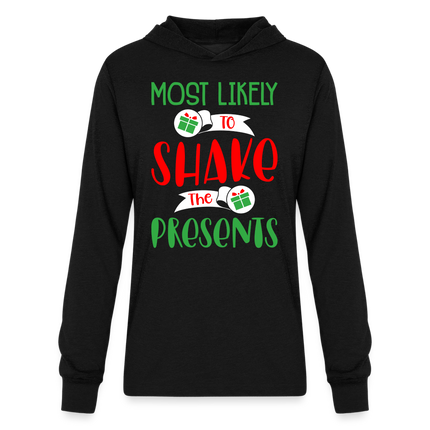 This festive hoodie features a whimsical design with the text "Most Likely To Shake the Presents." The print includes images of shaking presents, creating a fun and lighthearted look perfect for the holiday season.