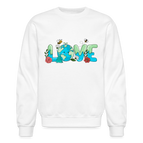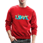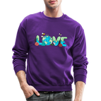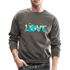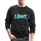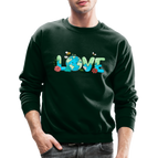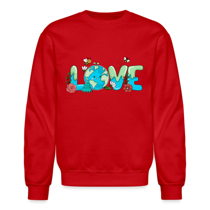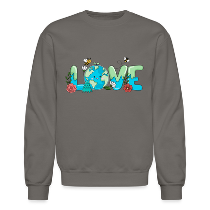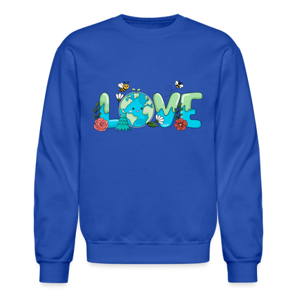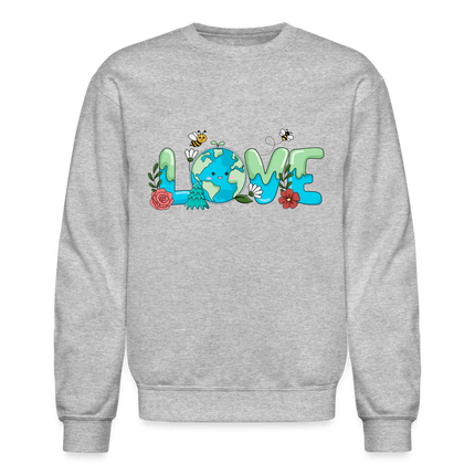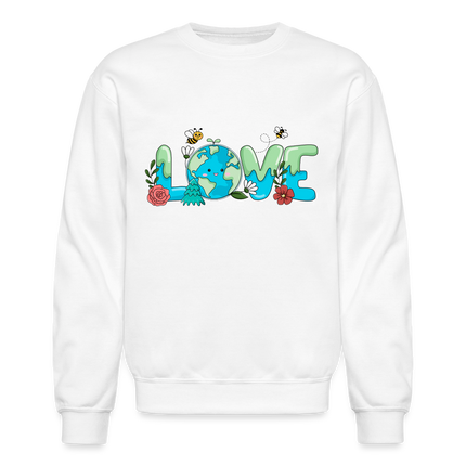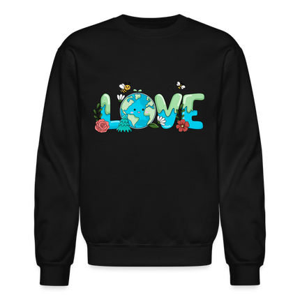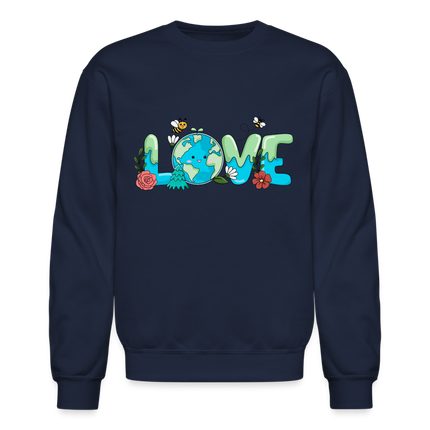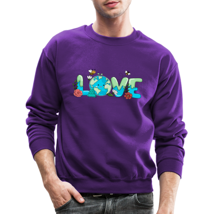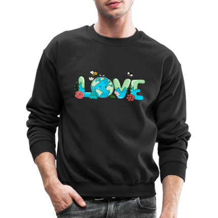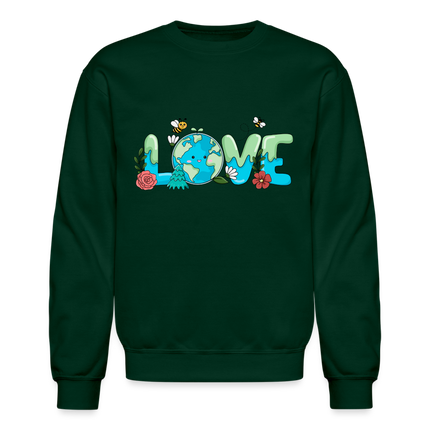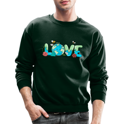 Featuring the word "LOVE" creatively designed with blue and green hues to symbolize the Earth, with the letter O depicted as our planet, this sweatshirt is adorned by charming bees, vibrant flowers, and lush trees. It's a stunning representation of our interconnectedness with nature and the importance of environmental conservation.
