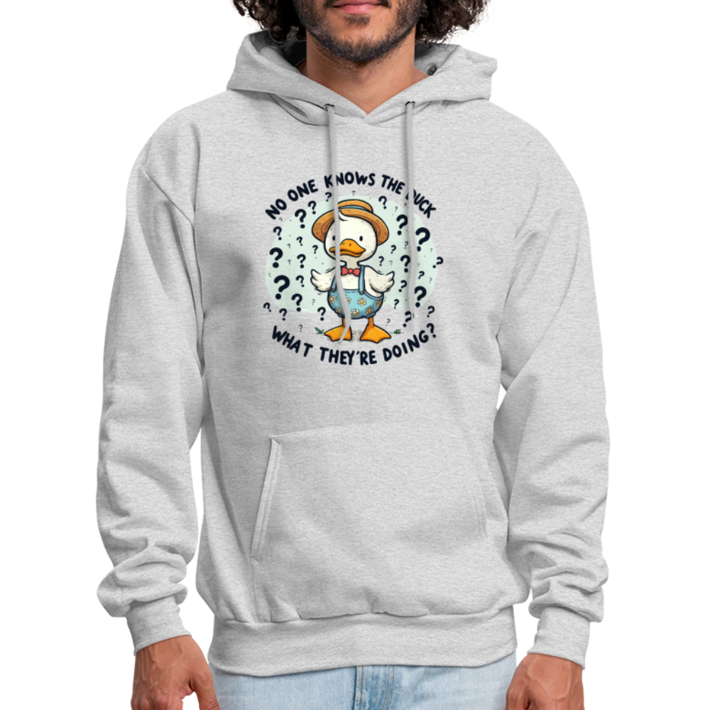 Introducing our "No One Knows The Duck What They're Doing" Hoodie – a hilarious and relatable piece that perfectly captures the confusion we all feel sometimes! This hoodie features a comical duck graphic surrounded by question marks, accompanied by the witty phrase "No One Knows The Duck What They're Doing," making it an ideal choice for anyone who appreciates humor and a bit of self-deprecation.