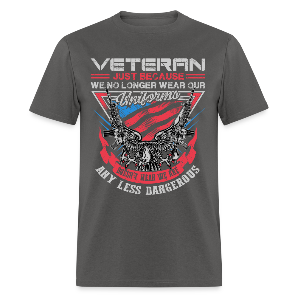 The eye-catching design prominently features the text "Veteran Just Because We No Longer Wear Our Uniforms Doesn't Mean We Are Any Less Dangerous." This powerful statement emphasizes the fact that veterans continue to possess the skills, knowledge, and resilience acquired during their service, regardless of their attire. The word "Veteran" is boldly highlighted in white letters, drawing attention to the central theme and reinforcing the pride and identity associated with this honorable title.