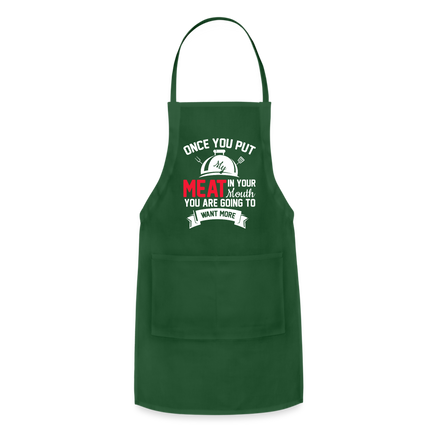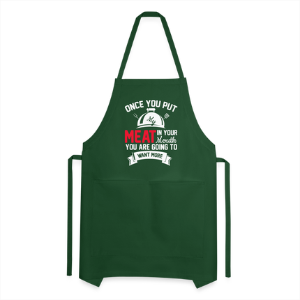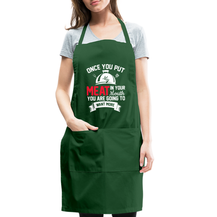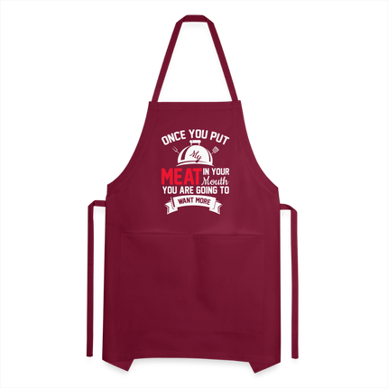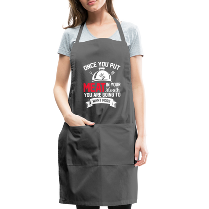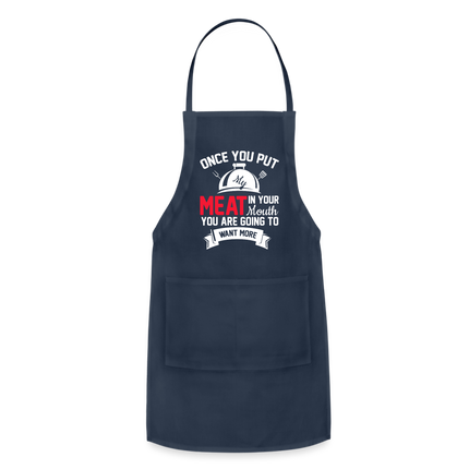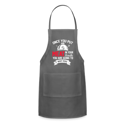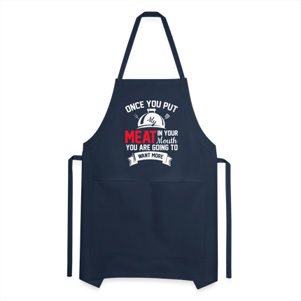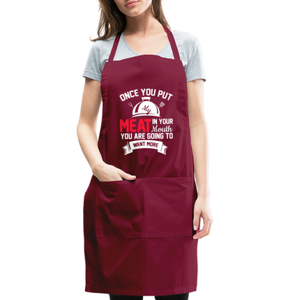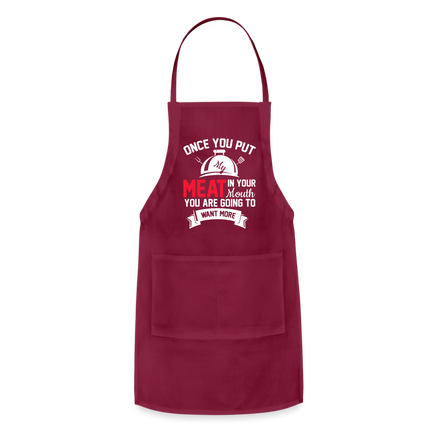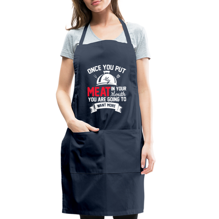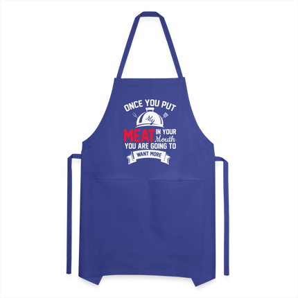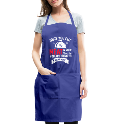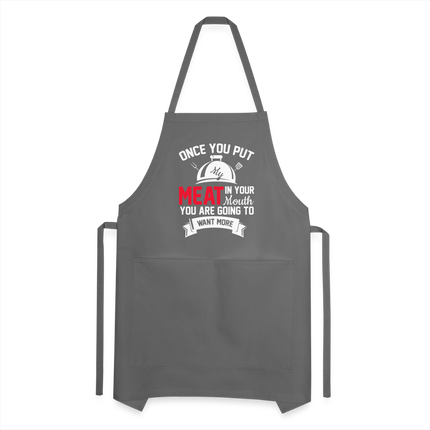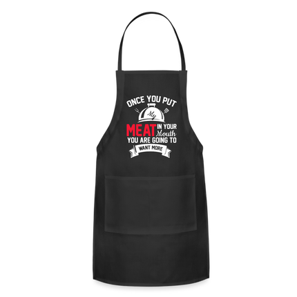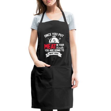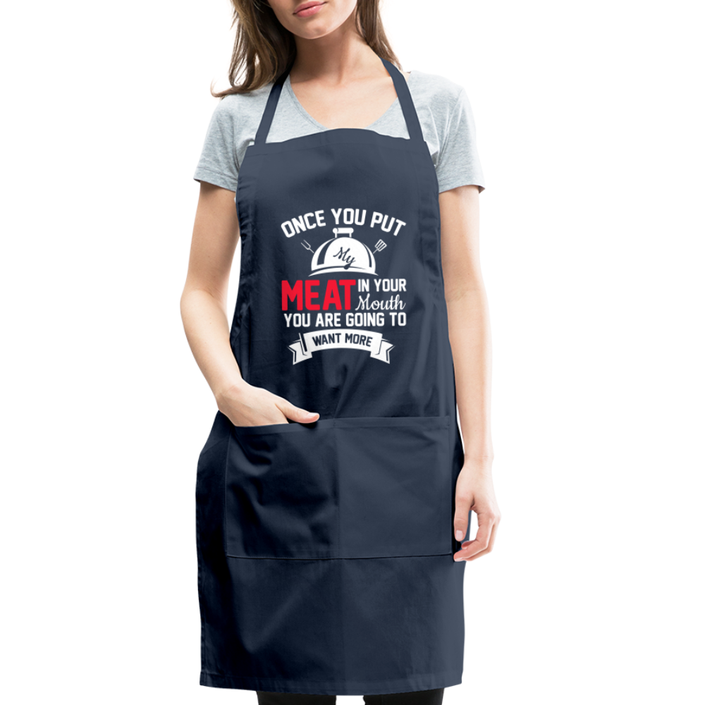 Elevate your grilling game with our "Once You Put My Meat In Your Mouth You Are Gonna Want More" Apron! Ideal for BBQ aficionados with a taste for humor, this apron boasts a cheeky slogan alongside a fun graphic of a BBQ grill and spatulas.
