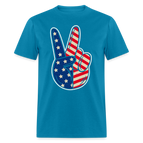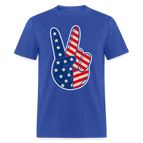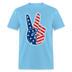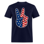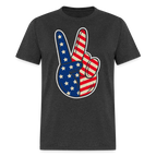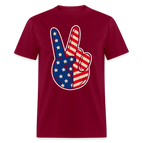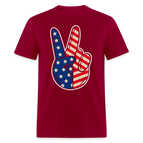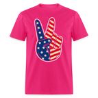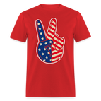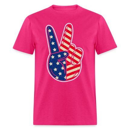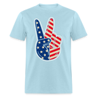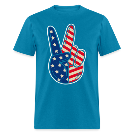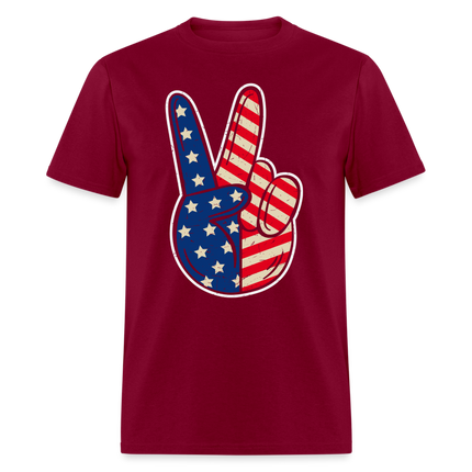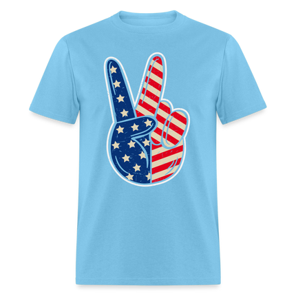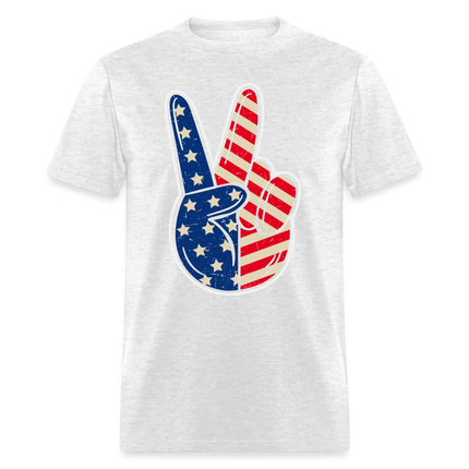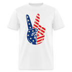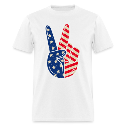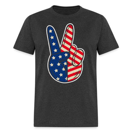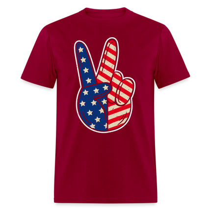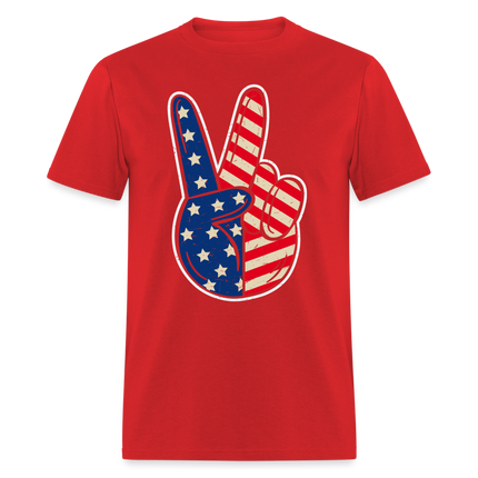 Introducing our "Peace Sign American Flag" T-Shirt, a harmonious blend of patriotism and a universal symbol of peace. This t-shirt features a captivating print design showcasing a peace sign hand gesture filled with the iconic colors of the American flag.
