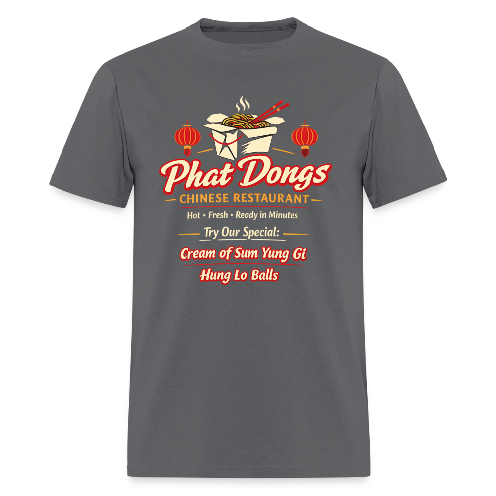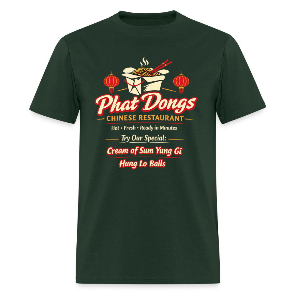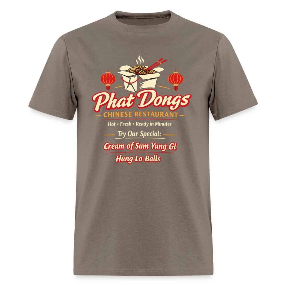The Phat Dongs T-Shirt delivers bold adult humor with a hilarious fake Chinese restaurant design that grabs attention the moment people read it. Styled like a classic takeout logo, this graphic tee features the unforgettable Phat Dongs name along with playful menu references like Cream of Sum Yung Gi and Hung Lo Balls. At first glance it looks like a real takeout spot, but the clever wordplay quickly turns it into a guaranteed double-take.