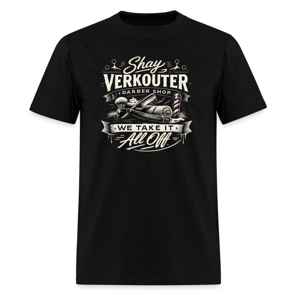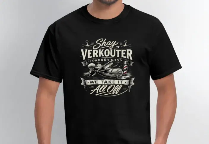 The Shay Verkouter Barber Shop T-Shirt brings vintage barbershop style together with bold adult humor and clever sexual innuendo. Featuring classic barber tools and the playful slogan We Take It All Off, this design delivers a sharp double meaning that’s confident, witty, and guaranteed to get laughs. It’s the perfect mix of old-school grooming vibes and cheeky wordplay.