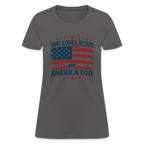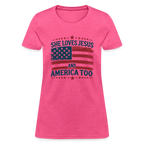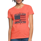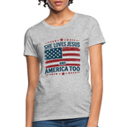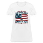 This She Loves Jesus and America Too Women's T-Shirt is Contoured and Side Seamed for a Feminine Fit – RUNS SMALL