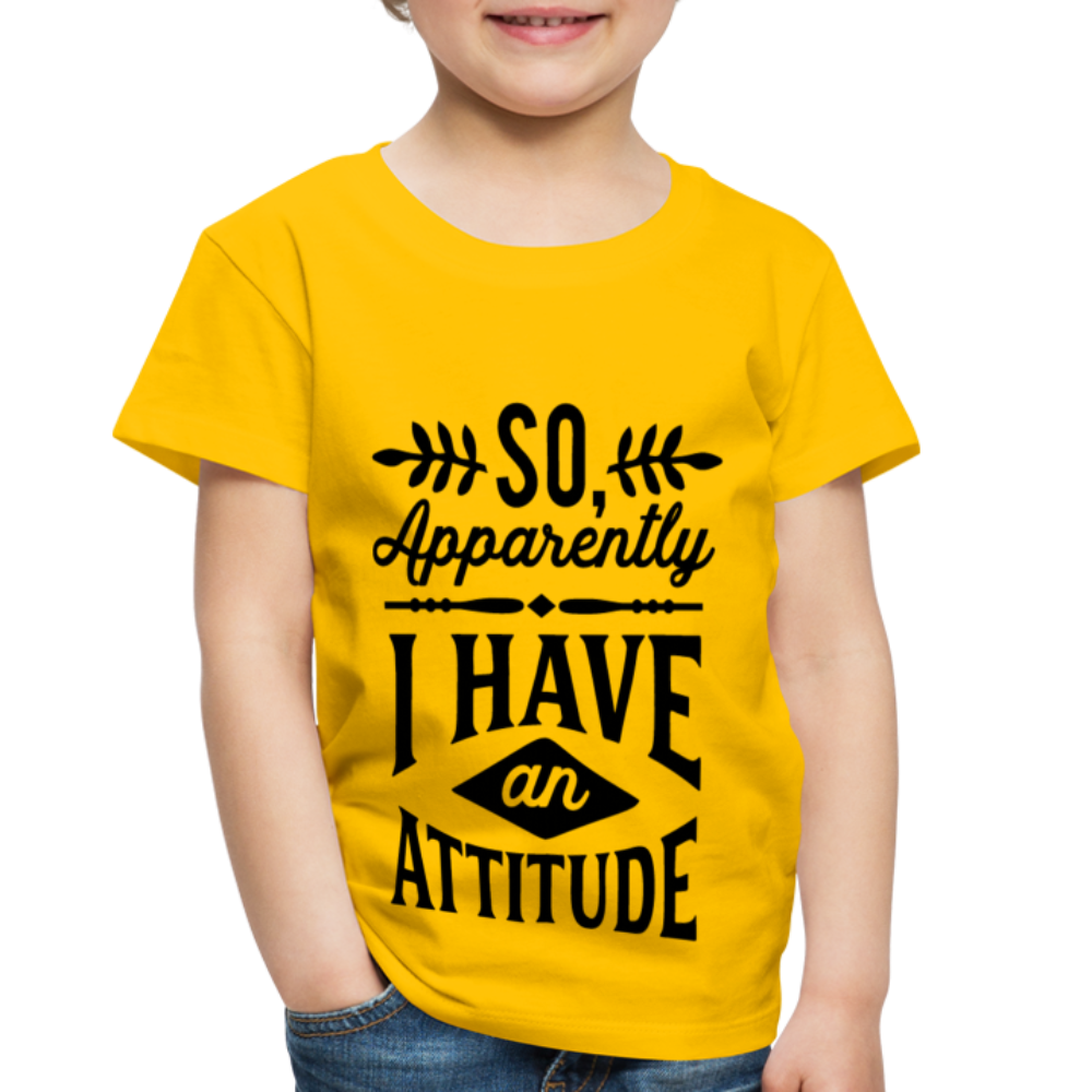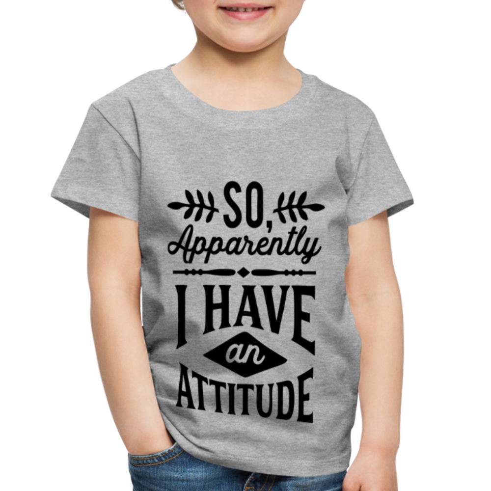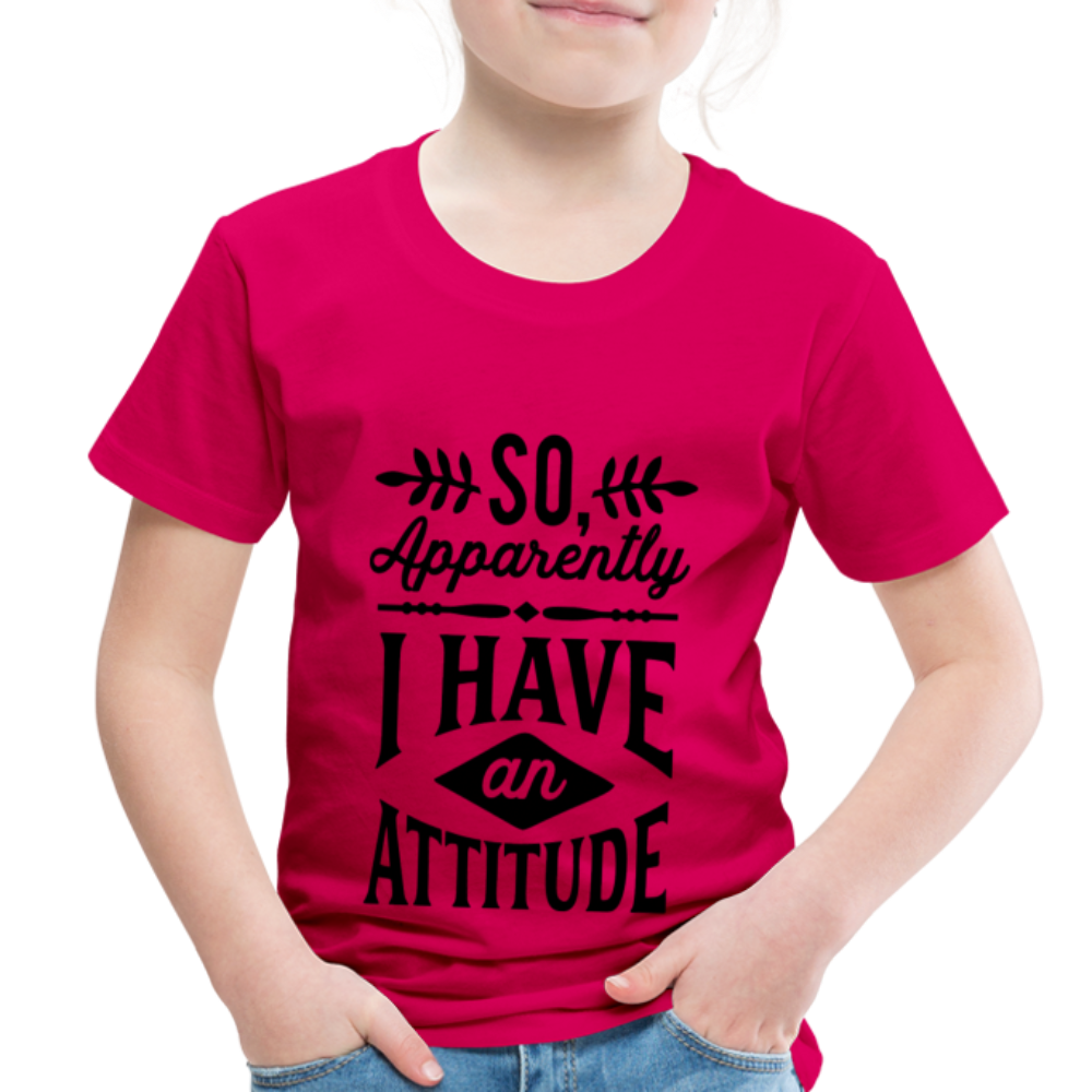 Introducing the "So Apparently I Have An Attitude Toddler Premium T-Shirt" - a cute and playful way to acknowledge that even toddlers can sometimes display a strong or assertive demeanor. This premium toddler t-shirt playfully suggests that your little one might have an attitude of their own. Designed for both comfort and quality, the fabric ensures your toddler feels at ease while sporting this lighthearted message. The sentiment resonates with parents who understand the spirited nature of toddlers, creating a sense of shared understanding and humor. Elevate your toddler's style while playfully celebrating their unique personality with our "So Apparently I Have An Attitude Toddler Premium T-Shirt."