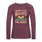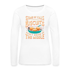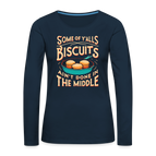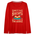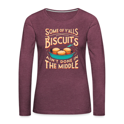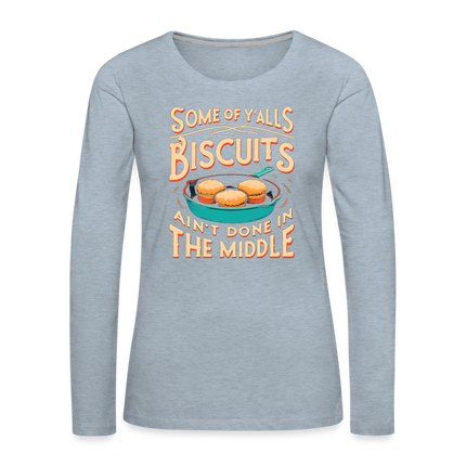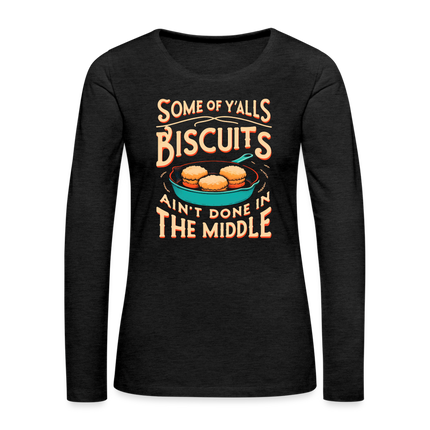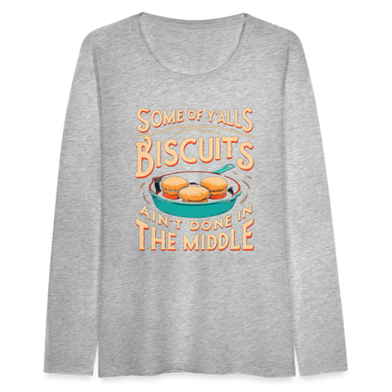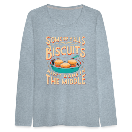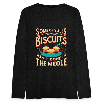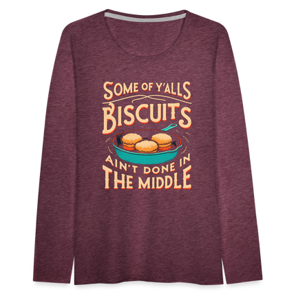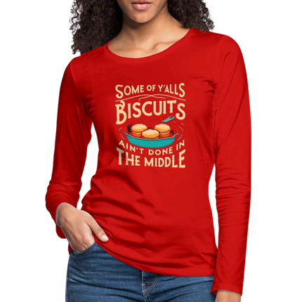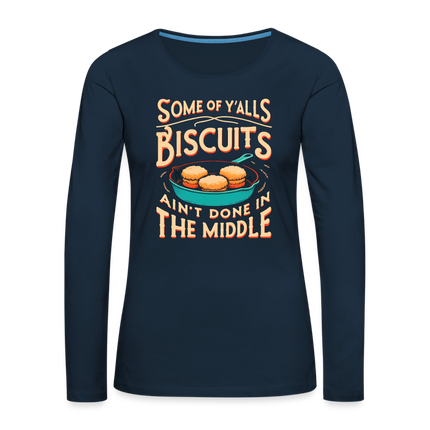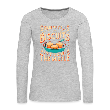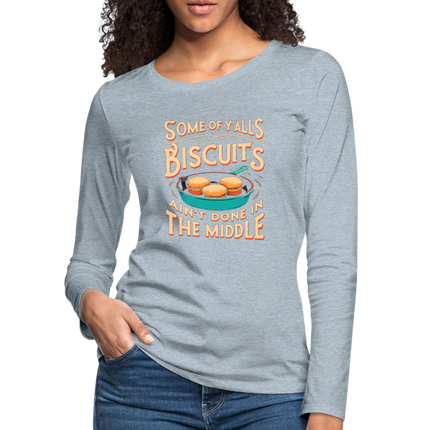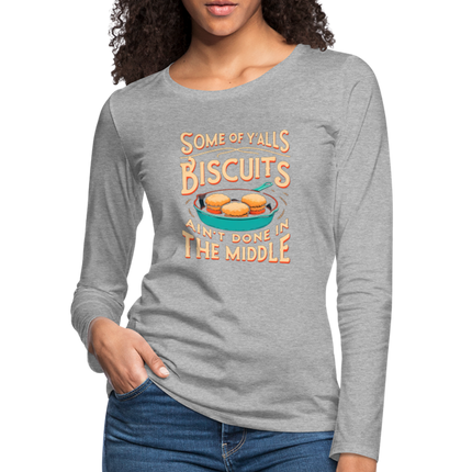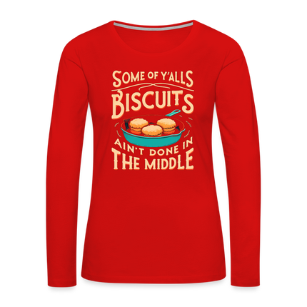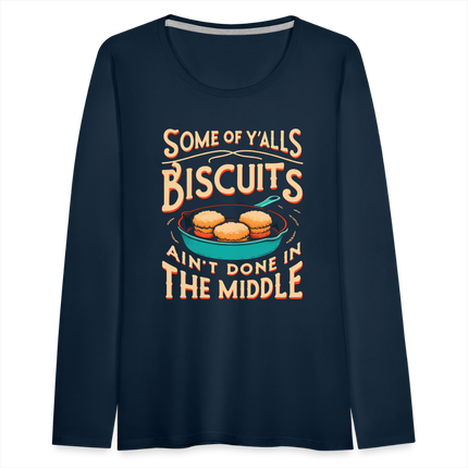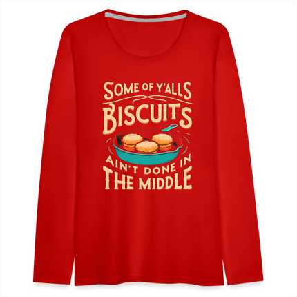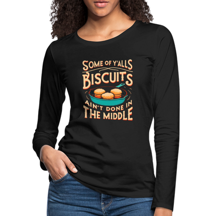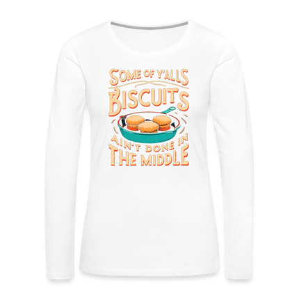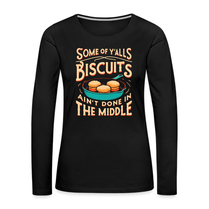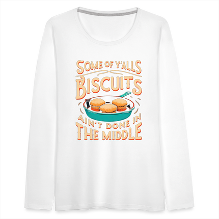 Introducing our "Some of Y'alls Biscuits Ain't Done in the Middle" Women's Premium Long Sleeve T-Shirt, where southern charm meets playful humor!