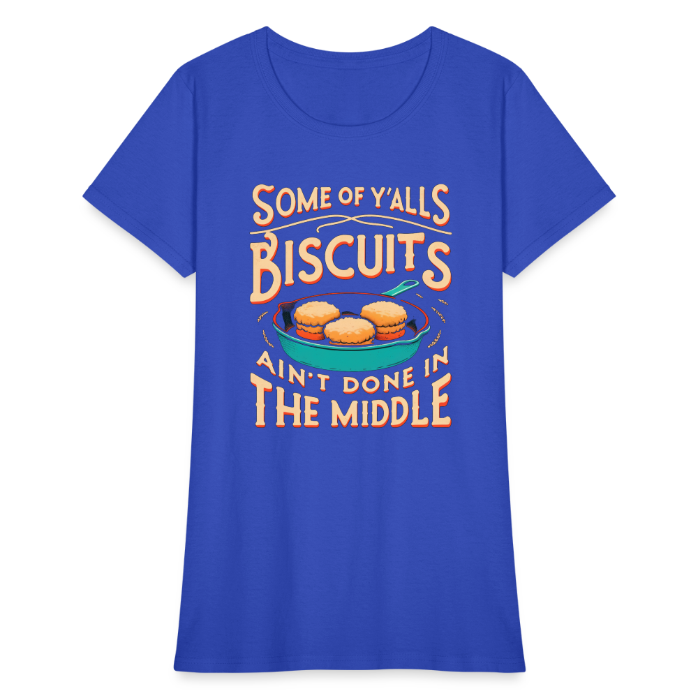 Whether you're a true southern belle or just appreciate a good laugh, our "Some of Y'alls Biscuits Ain't Done in the Middle" Women's T-Shirt is a must-have addition to your collection. Embrace your southern roots and showcase your playful personality with this fun and quirky tee!
