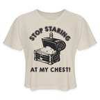 Our "Stop Staring At My Chest" Women's Cropped T-Shirt adds a playful and light-hearted twist to your fashion statement. This trendy cropped T-shirt features an amusing image of a treasure chest, and below it, the words "Stop Staring At My Chest" are boldly printed.