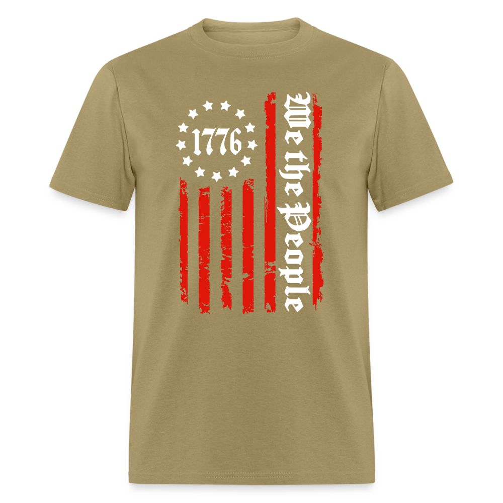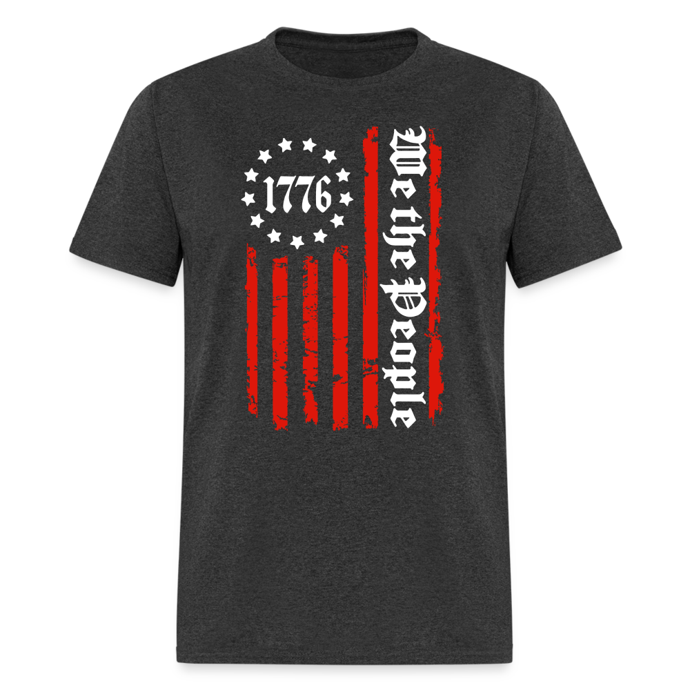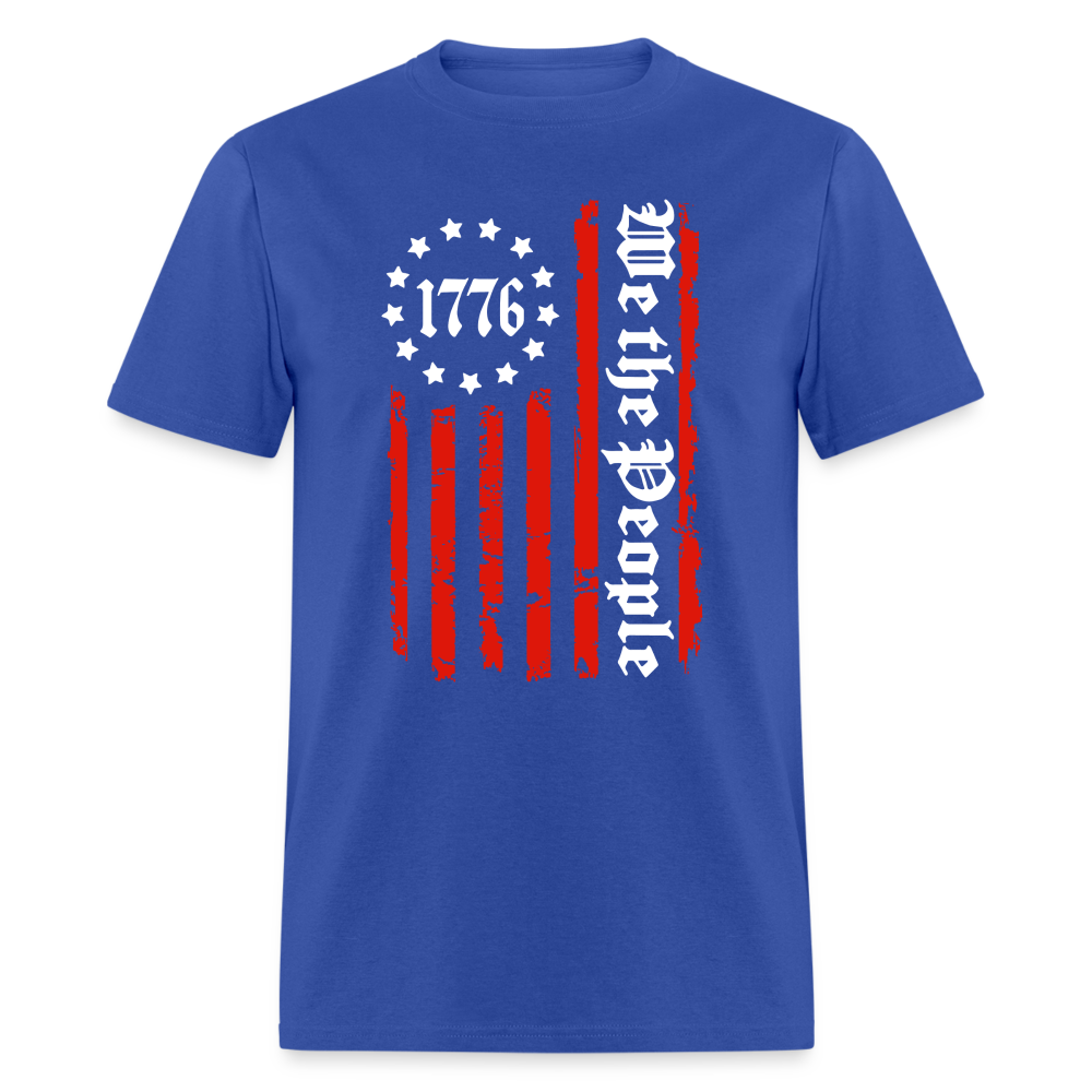 At the forefront of this design is the revered American flag, with its signature red and white stripes. However, what sets this t-shirt apart is the ingenious incorporation of the phrase "We The People." Instead of one of the flag's traditional stripes, "We The People" runs vertically from the top to the bottom of the flag, serving as a striking and symbolic replacement.
