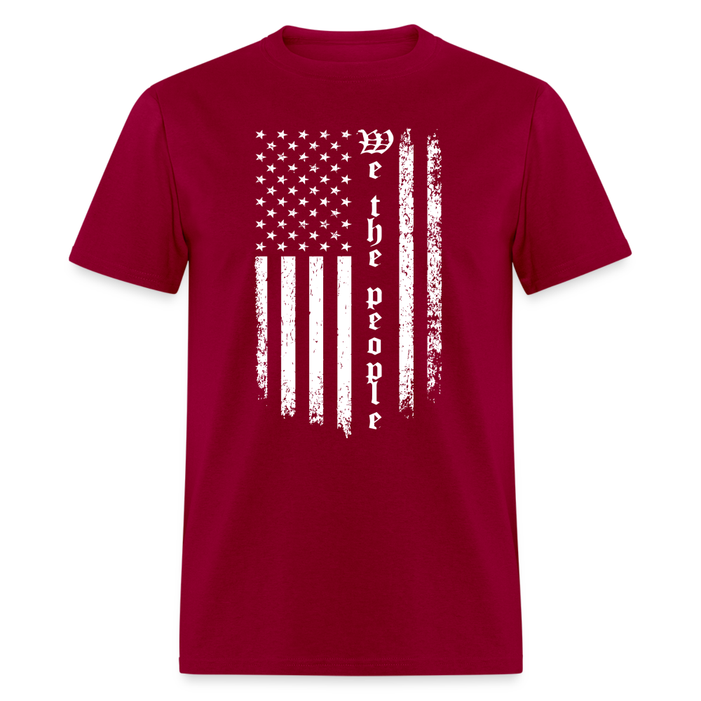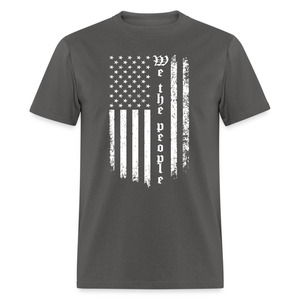 The standout feature of this t-shirt is its striking design: an American flag in white, with the powerful phrase "We The People" elegantly running down the flag. This visual representation serves as a reminder of the democratic ideals that our nation was built upon and the importance of citizen participation in shaping our society.